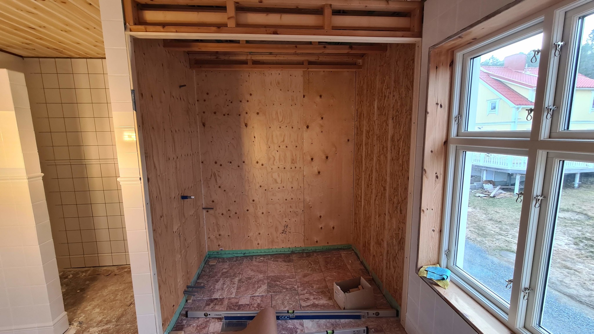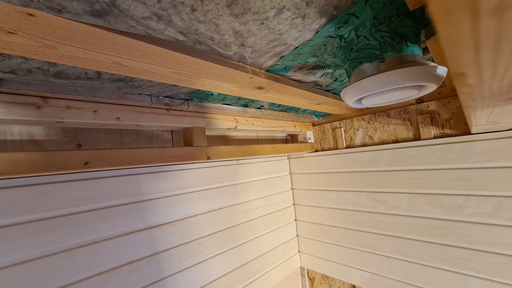 Väggen mot yttervägg har fått lite gles på 12mm för luftspalt som är öppen ned från golv och upp till utrymmet ovanför bastun. Panelen på övriga väggar sitter direkt mot innervägg som är isolerad med 95/145mm stenull.