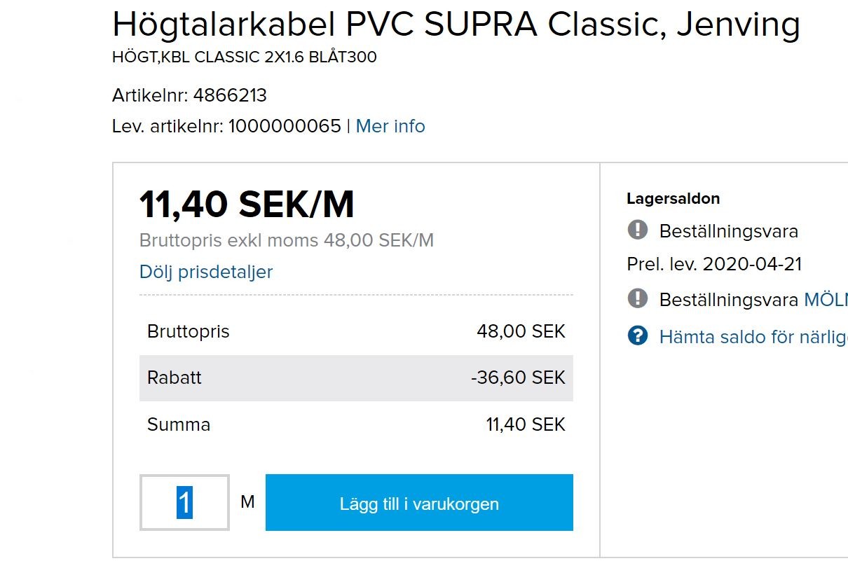Jag kan i princip garantera att de priserna mycket sällan representerar ett listpris hos tillverkaren. Ett bra exempel är Jenving högtalarkabel som vi köper både av tillverkaren och Ahlsell. Exempelvis E nummer 4866213 . Denna kostar Hos Ahlsell Brutto 48:-/m, Netto 11,40:-/m exkl moms vid köp av 300m rulle. Jenvings ÅF lista som är dyrare än Distributörernas pris Har ett listpris inkl moms på 22:-/m dvs 17,6:-/m exkl moms. Så detta listpriset från tillverkaren har Ahlsell lagt på nästan 300% på. Innan de skapat en rabattsats på 75%. Hos Jenving som ÅF betalar vi 9,7:-/m netto för samma kabel. dvs ca 15% Billigare än av Ahlsell efter deras monsterrabatt. Jag har sett samma scenario när vi köpt el kapslingar av Hager. Så NEJ Ahlsell visar inte sannolikt aldrig verkliga listpriser, bara egna hitta på listpriser. Så jag tycker man kan bestämt hävda till en leverantör som Fyrstads El att de priser de lämnat inte har något med tillverkarens Listpris (Rekommenderade priser finns inte), att göra. Man kan dessutom bestämt hävda att de inte på något vis är marknadsanpassade och därigenom på en nivå som kunden utan att fått en prisuppgift inte har kunnat förutse då den vida överstiger marknadspriser på samma produkter.C Calore skrev:Priserna är inte påhittade, det är tillverkarnas rekommenderade priser.