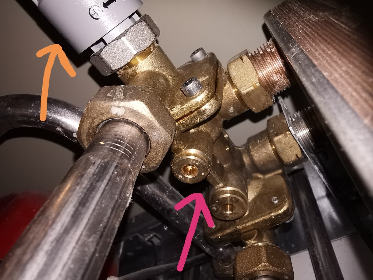 Termostaten är satt på max (markerad med orange i bilden) men en bild i instruktionsboken som ska föreställa en reglerventil ser inte alls som ut som i verkligheten. Antingen saknas den eller också är det de ventiler (ställskruvar?) som syns markerade med rosa pil - kan dessa öppnas?