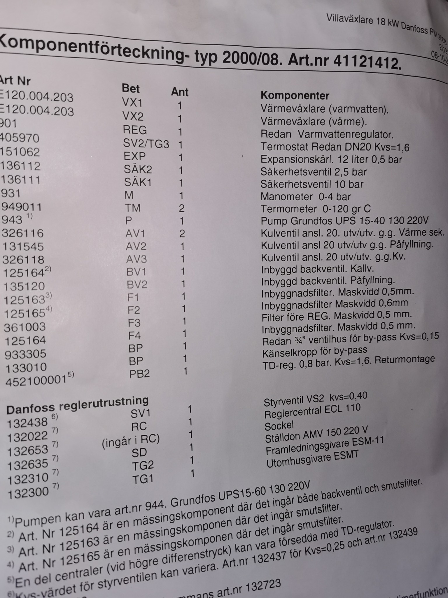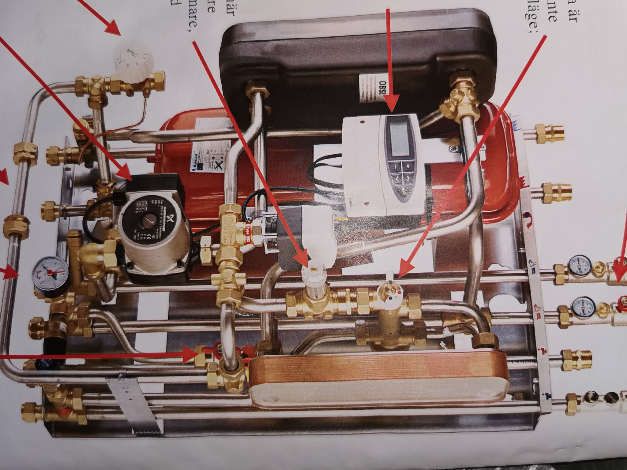 Jo men fjärrvärmen går ju stänga av så det är inga problem. Instruktionsbok finns men typiskt nog stämmer den inte med bilden just på regulatorn. Art nr finns men den är ju också tveksam, men det går säkert lösa om man ringer demJ jonaserik skrev:Att byta själv är lite diffust då ventilen är kopplad mot FJV och kanske är 100 C där, så tänk till lite att börja med så det inte händer en olycka. Sök på namnet/typ på din ventil så kan du kanske se vad alla skruvar/inställningar är till och för justering, har du manualen för hela paketet, det sitter en skylt någonstans.