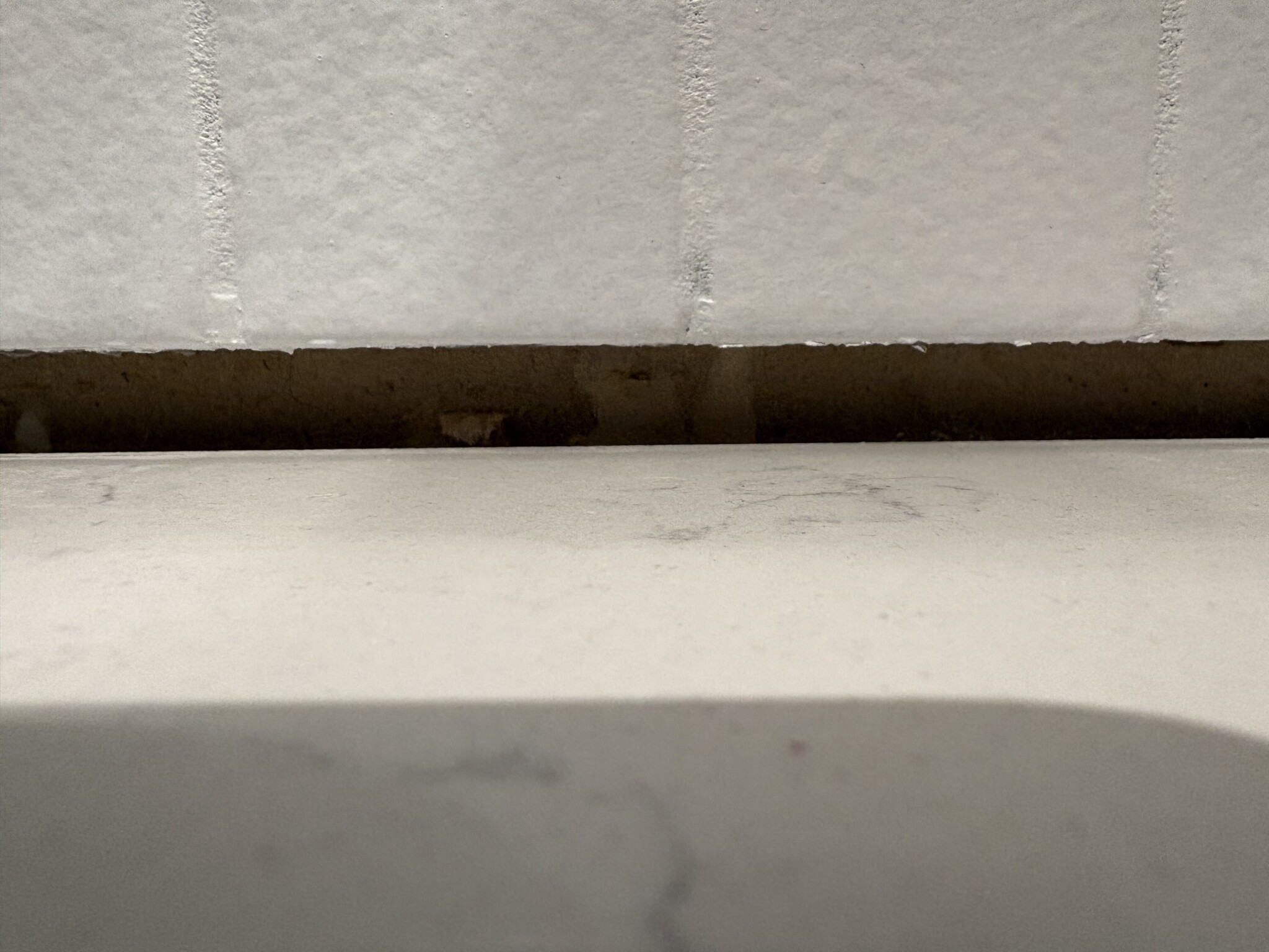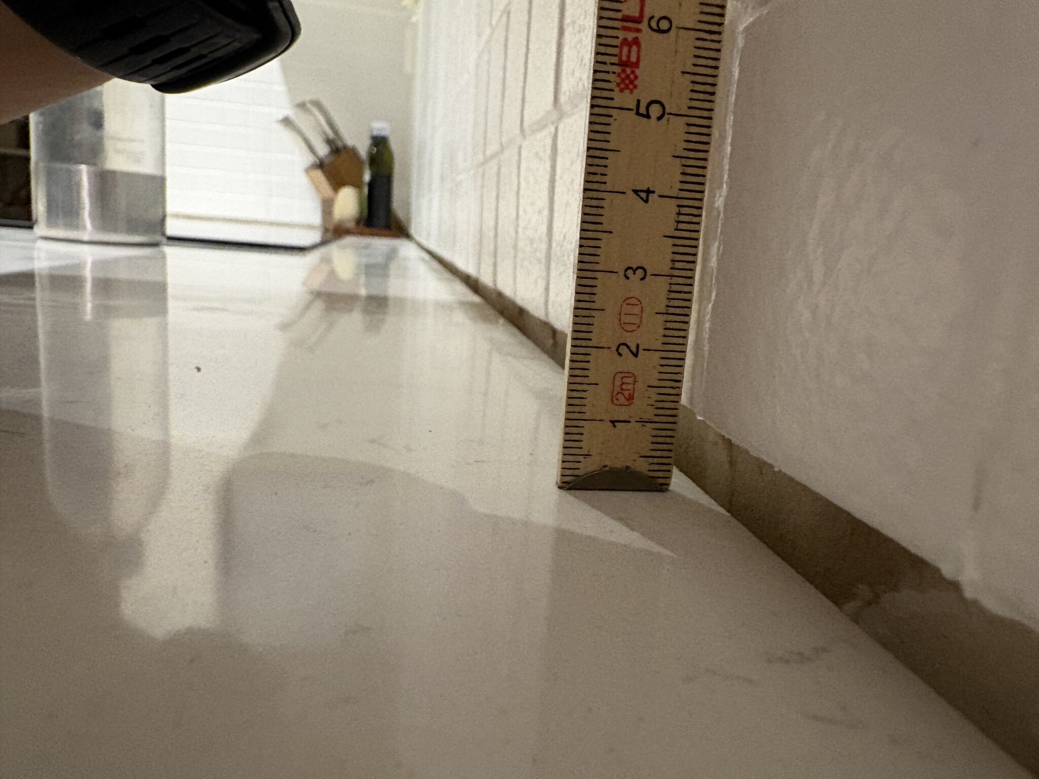 Idag har vi fått vår nya stenskiva monterad. Eftersom vi valde en skiva (av flera anledningar) som var 10 mm tunnare än vår tidigare så var vi medvetna om att det skulle bli en glipa. Leverantöreren (inte monterarna) sa att det går bra att foga med silikon men monterarna sa sen på plats att de inte gör silikonlösningar vid så stora mellanrum. Så här står vi.