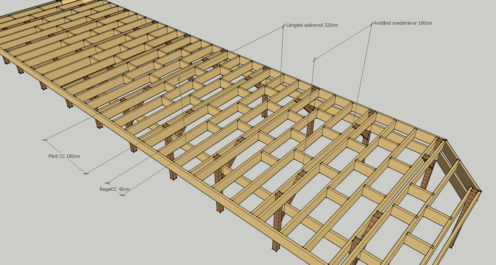 CC är 45cm och var tredje regel är stöttad av snedsträvor och de andra två med kortlingar enligt bild:
