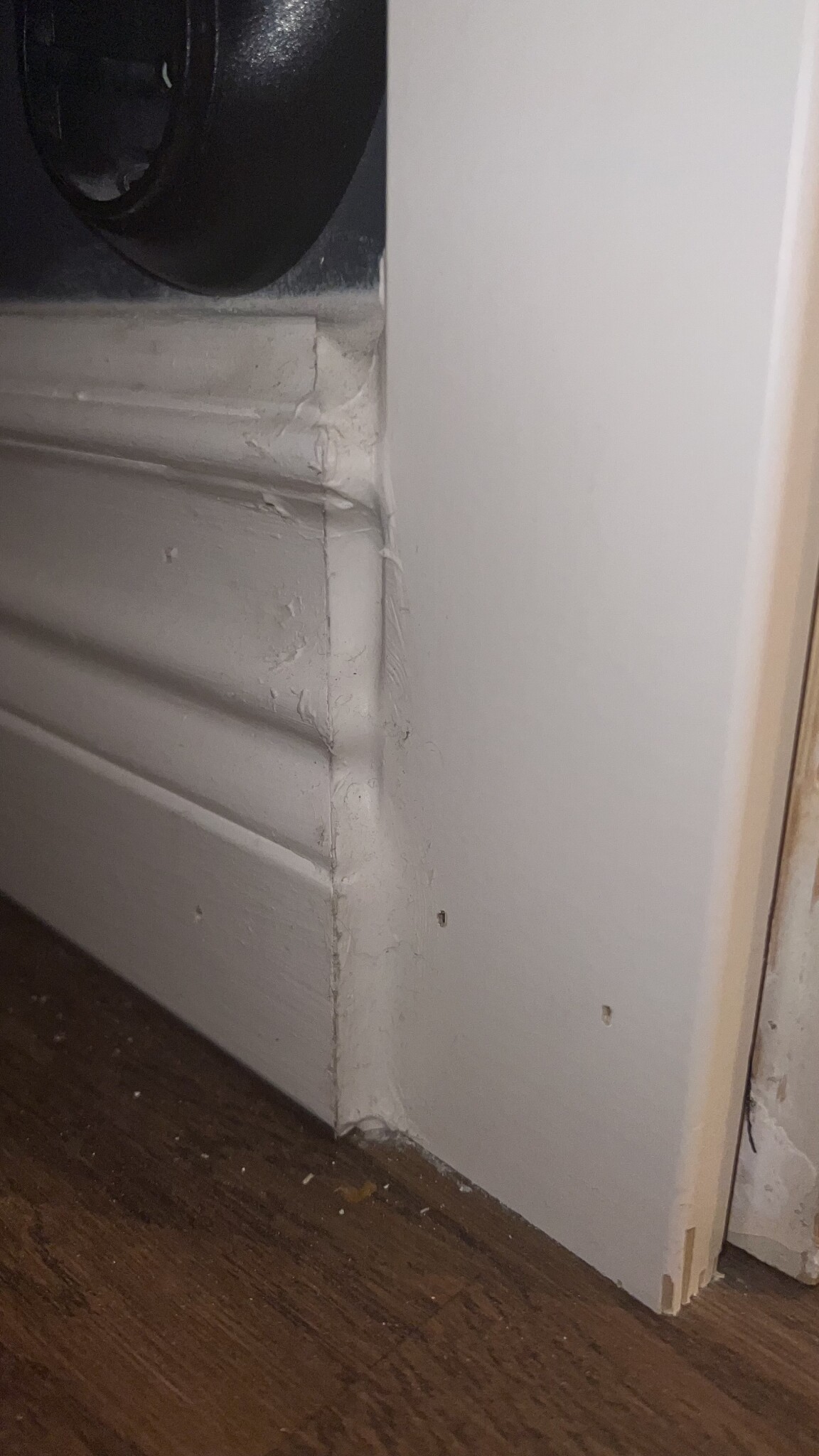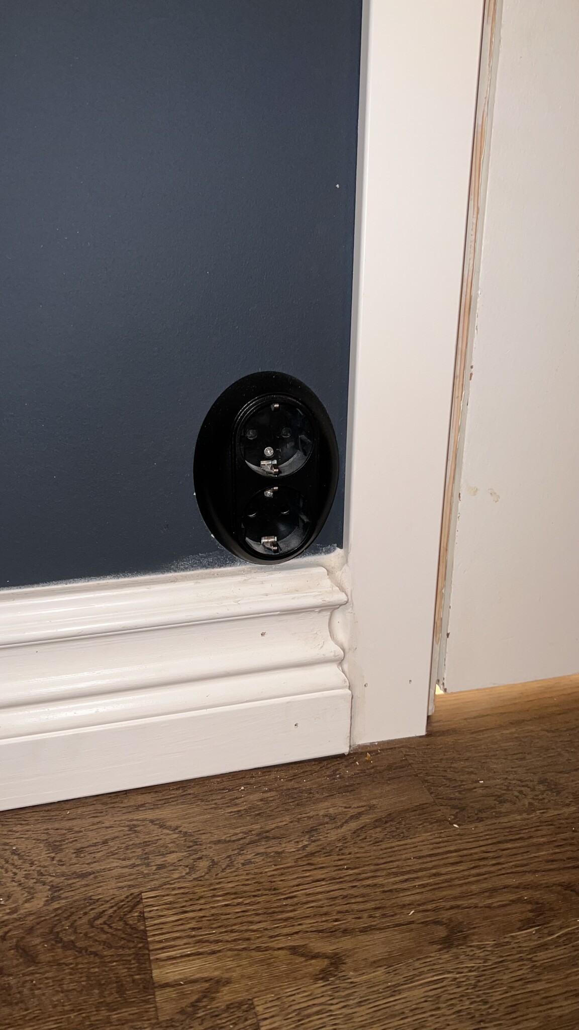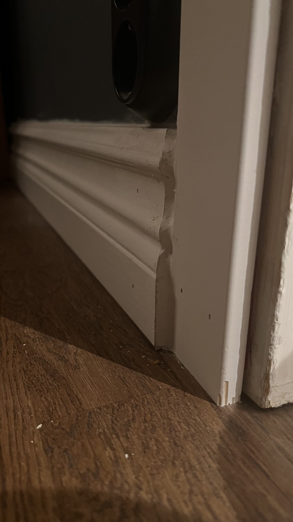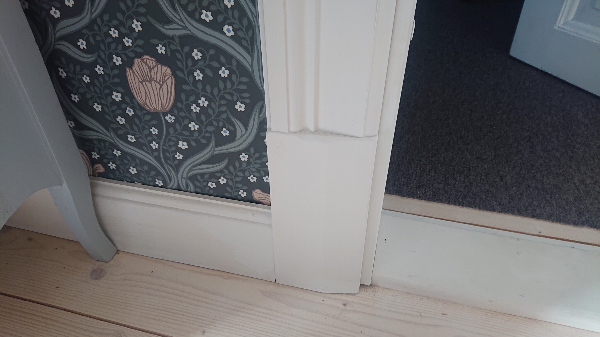 Har köpt en kåk som vi har börjat renovera rum för rum. På grund av stora hål och allmänt dålig gips i nederkant mot golv så måste vi köra med relativt höga golvlister. Har satt dessa socklar i ett rum och vi är jävligt nöjda så långt men det är en sak jag bara inte kan släppa - hur löser man övergången från golvlisten till det släta dörrfodret? 🤯