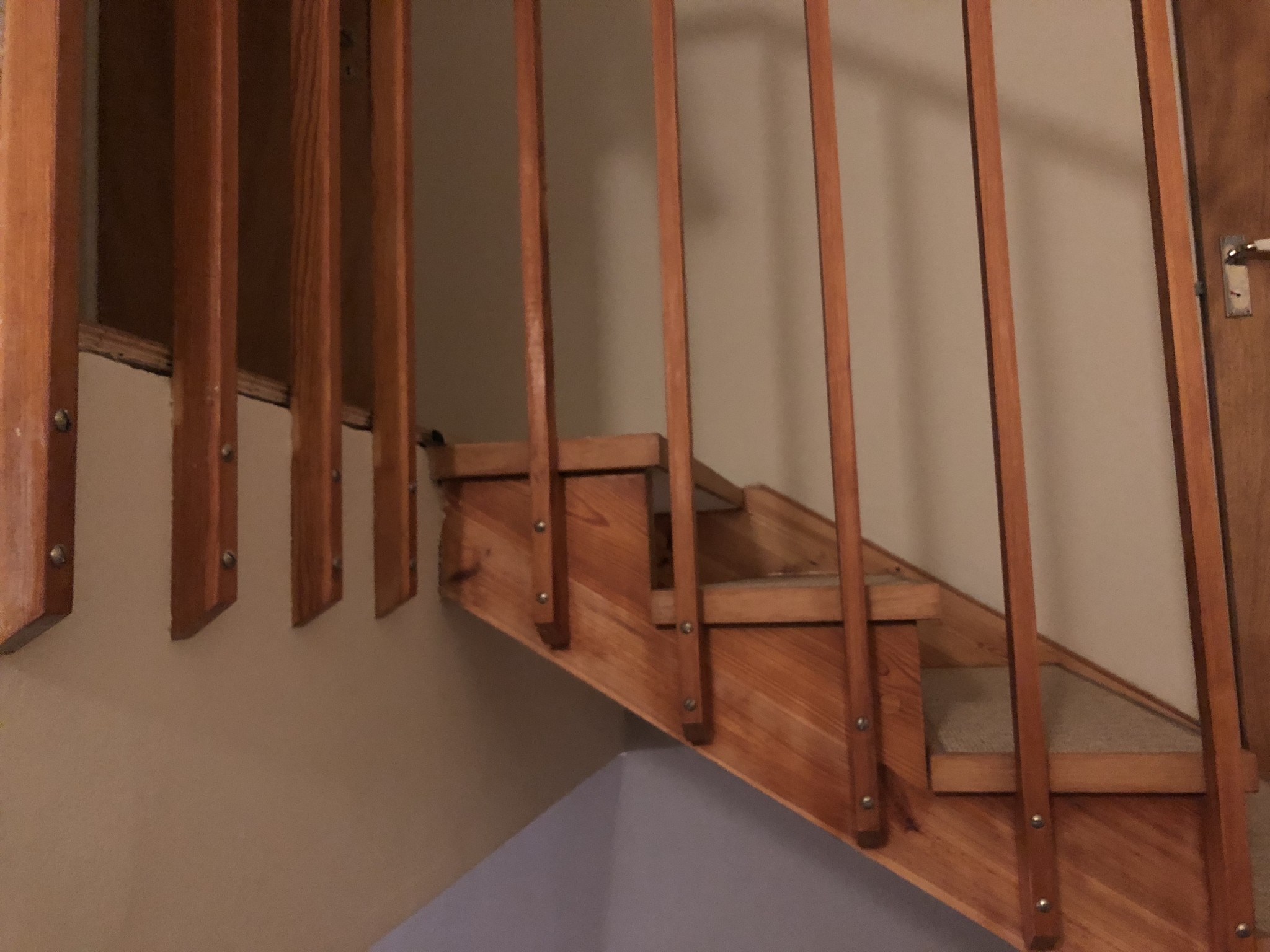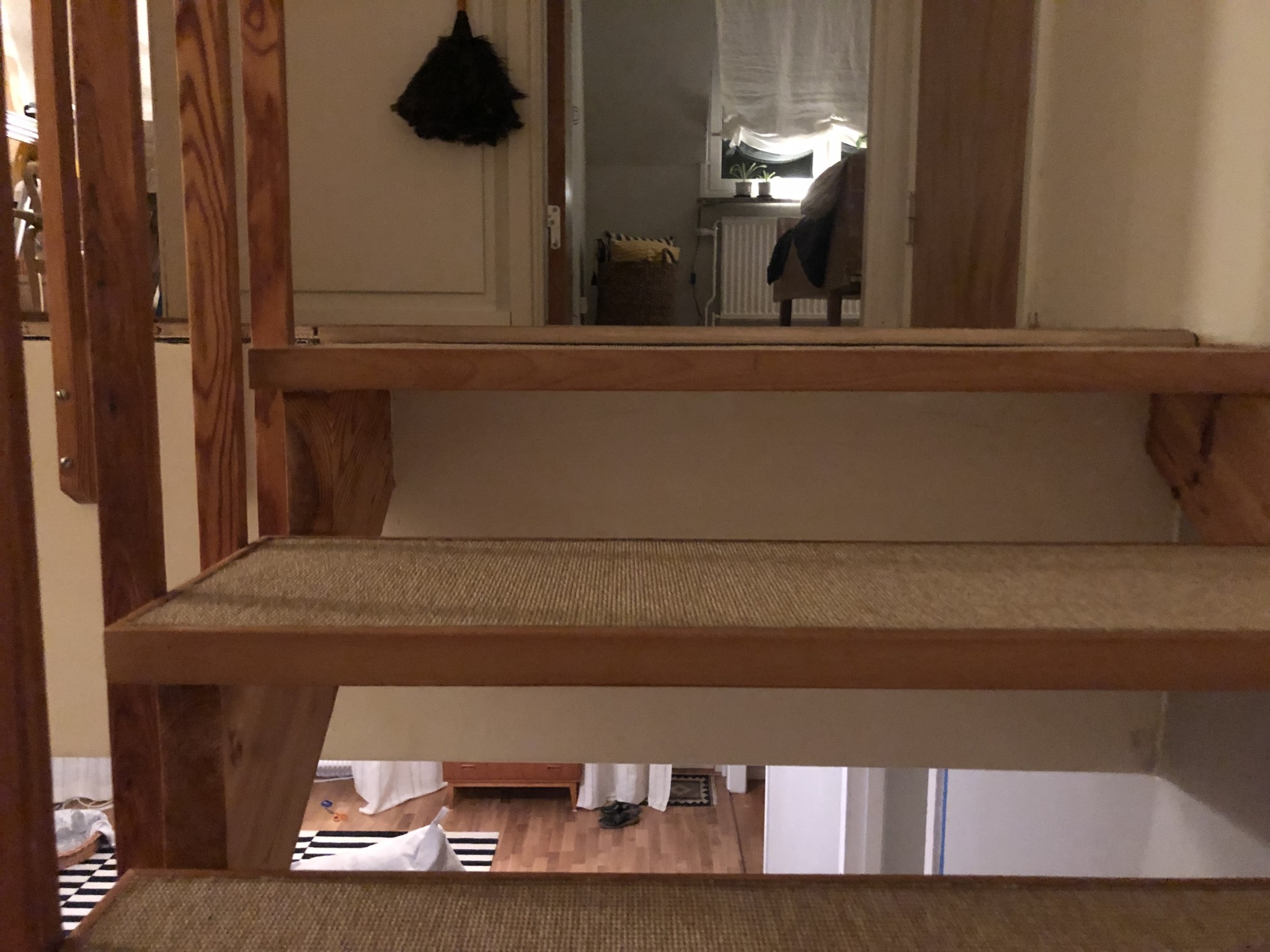 Jag vet inte om dessa bilder förklarar varför jag inte vill ha golv hela vägen ut, men översta trappsteget syns både från hallen och vardagsrummet. Om jag ska lägga golv hela vägen ut måste jag byta listen runt trappsteget (vilket iofs går fint) och då blir den listen dels högre än alla andra och dels i en annan nyans (eller har ni tips på att få ny eklist att se ut som 60 år gammal?) . Jag har en smärre upphakning på att det ska vara ”lika” och en annan list på översta trappsteget skulle nog störa mig mer än snubbelrisken. Jag har lagt ner ganska mycket jobb för att kunna bevara de gamla listerna och inte byta ut dem till nya. Mattan jag har lagt är 2 mm tjockare än den som låg där innan och under den var det masonit på vartannat trappsteg och tunna lager av masonit/spånskiva/furu på de andra. Det hade varit enklare att ta bort de gamla listerna och sätta nya än att som jag har gjort hyvla ned varje trappsteg 2 mm.