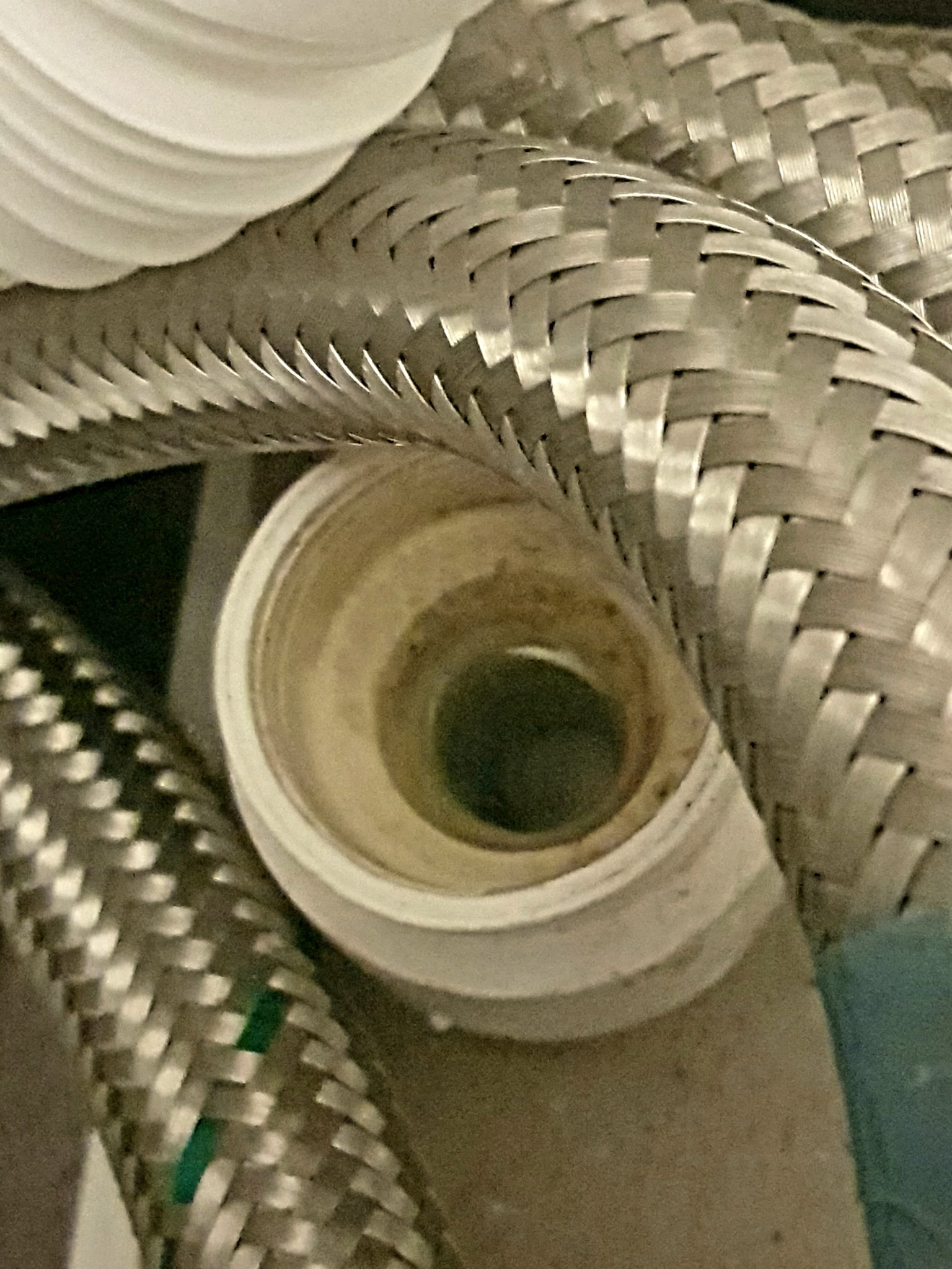 Det läcker vatten mellan avloppsslangen och det lilla vattenlåset.