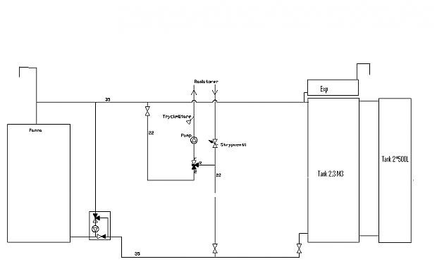 Skall alltså ha en hemmabyggd tank på 2300l + 2*500 Och måste dra tilloppet högre än jag kan ha exp. Rör mellan panna och tank ca 2,5m långt d35.
