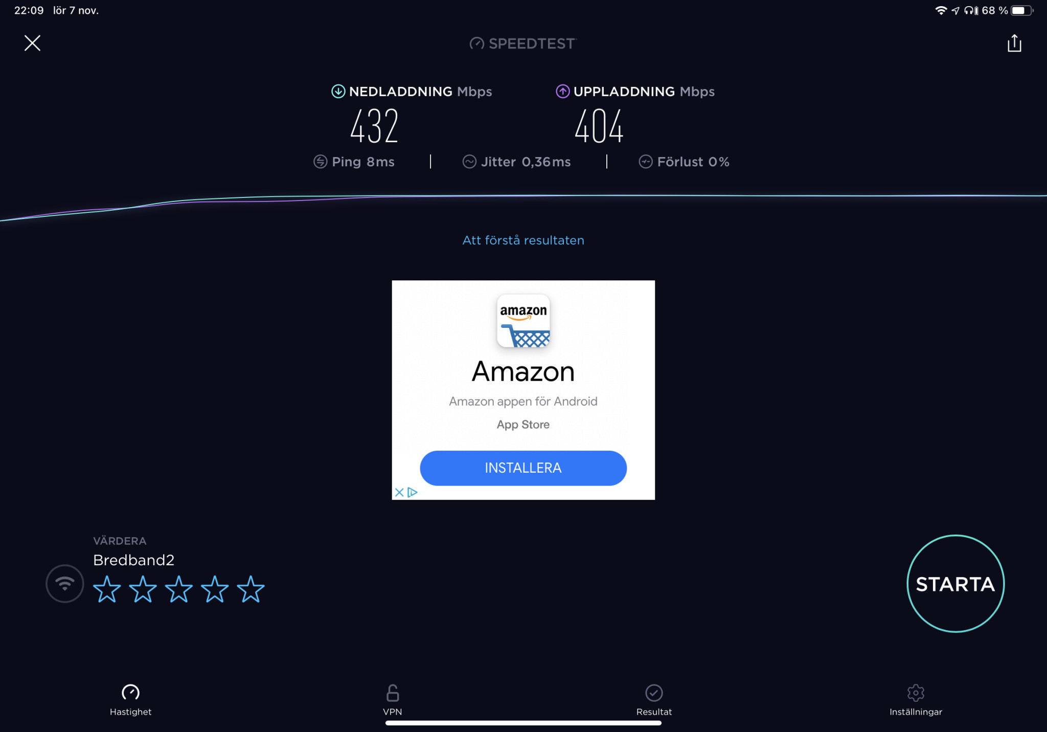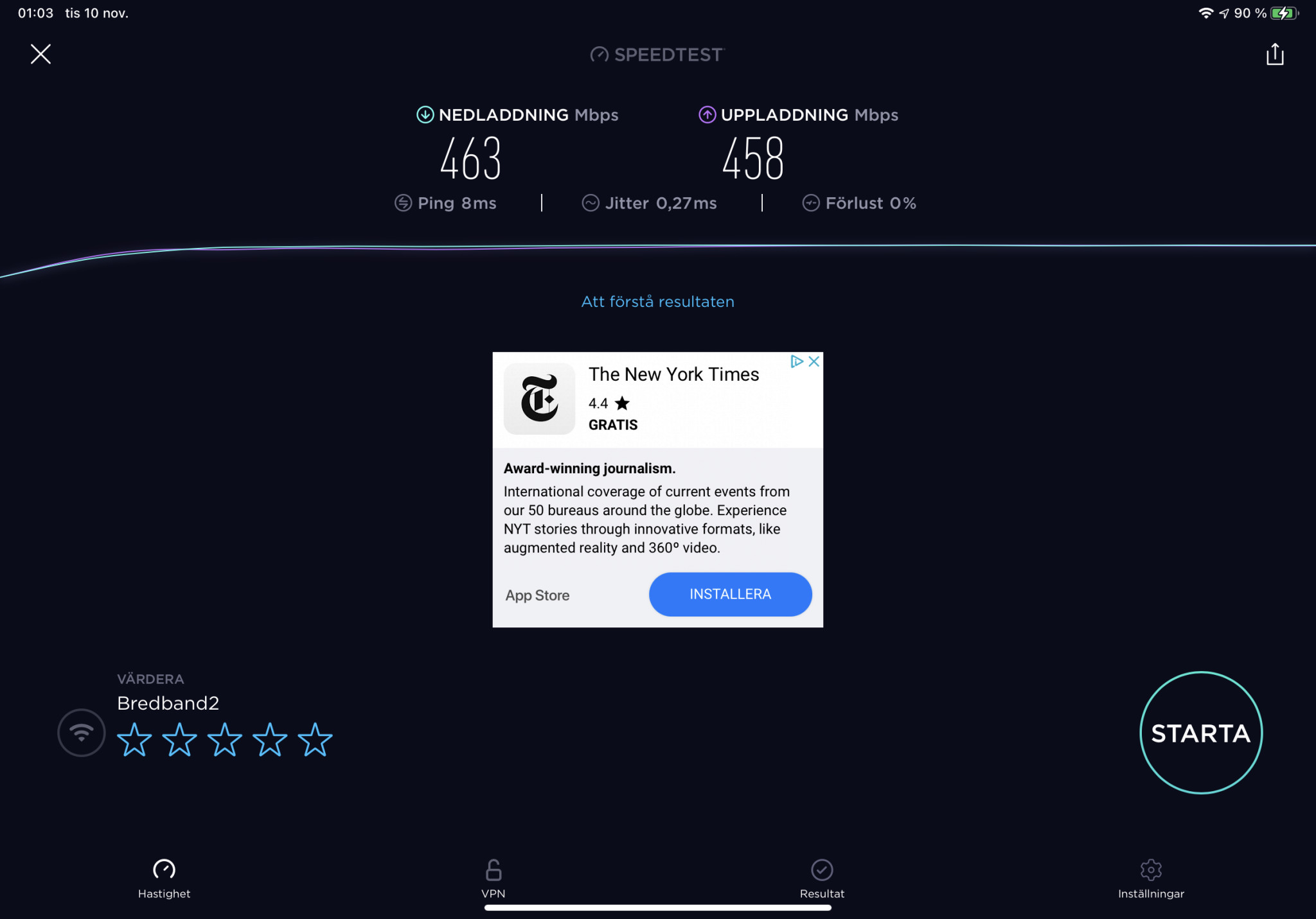 Så Speedtest får bli test av wifi hemma och Bredbandskoll hur fungerar Internetanslutningen.
