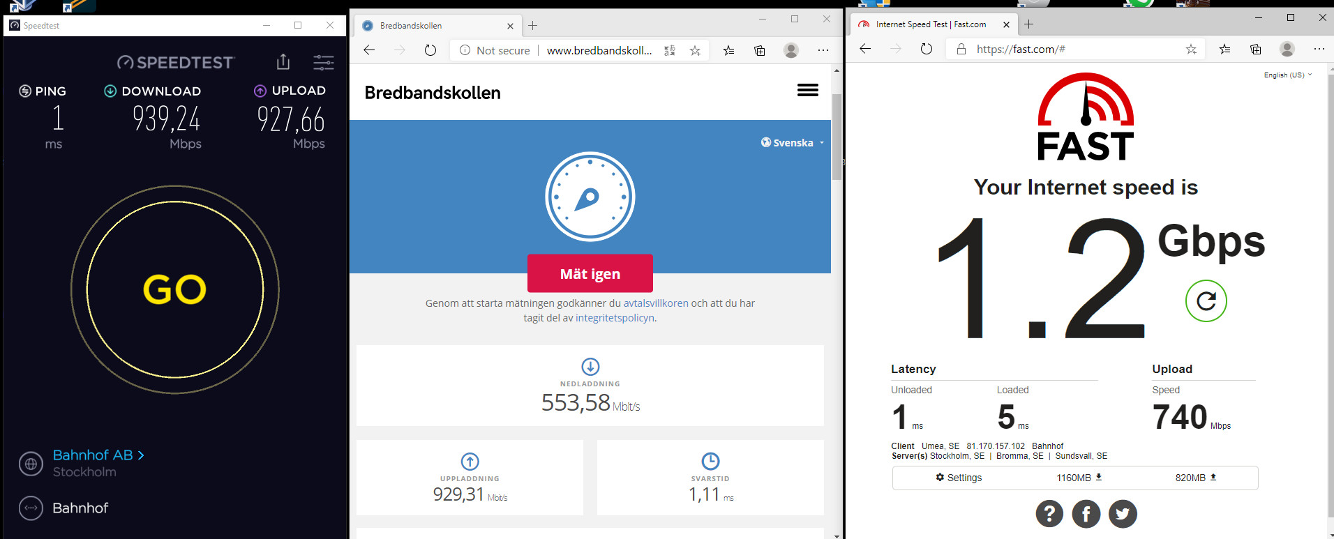 Det där med Speedtest och TP-Link M9Plus samt "operatörerrouter" med avslagen wifi och får då 500 Mbit/s både upp/ned trådlöst. Men med Bredbandskollen blir det helt andra värden, det varierar mellan 100-250 Mbit/s upp/ned. Så Speedtest verkar ha en lite för optimistisk mätning men kanske mera för att verifiera wifi-delen.