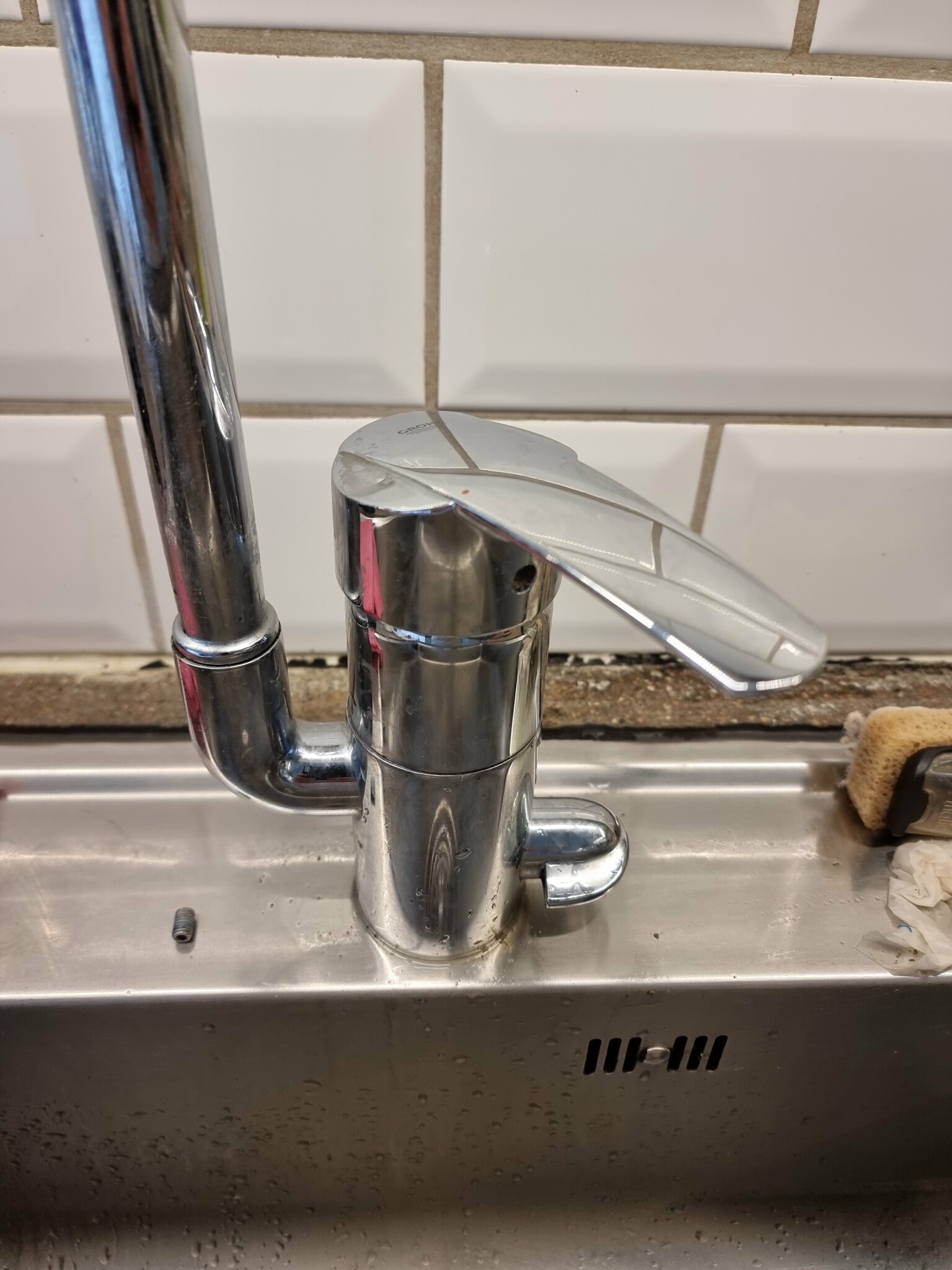 Prova att värma handtaget med en hårtork. Det kan finnas en del kalkavlagringar, prova att spreja upp ättikslösning. Prova att knacka försiktigt underifrån, lägg en brädbit emellan för att inte skada handtaget. Det kan sitta rejält fast, prova också att knacka från olika håll på handtaget.