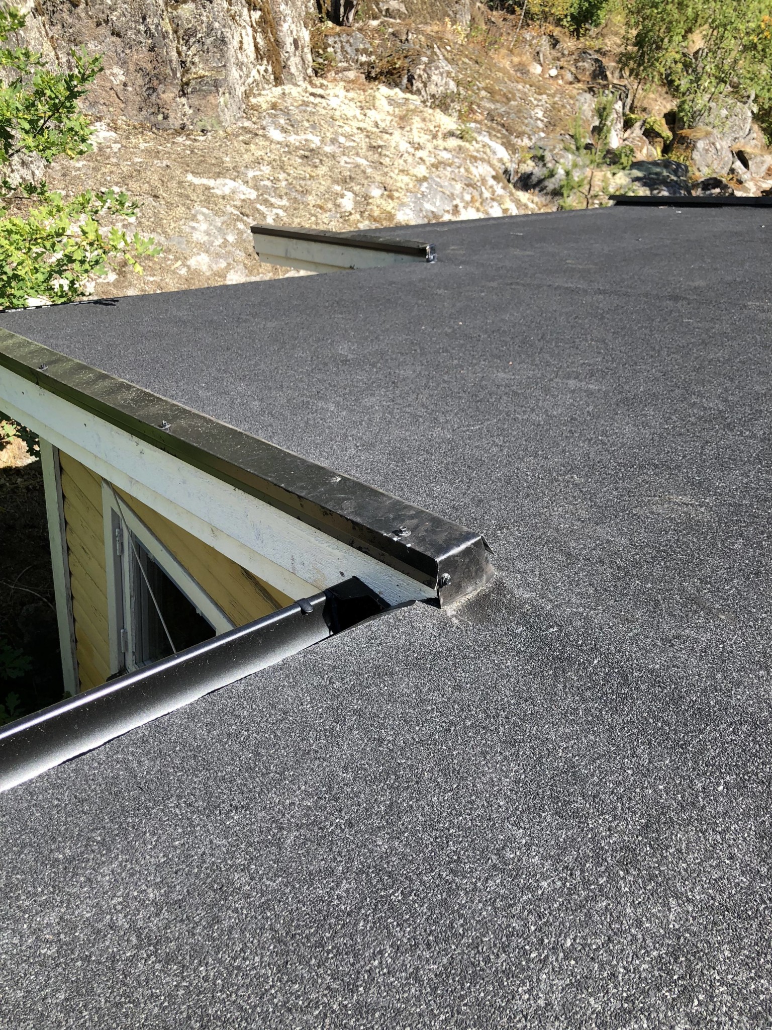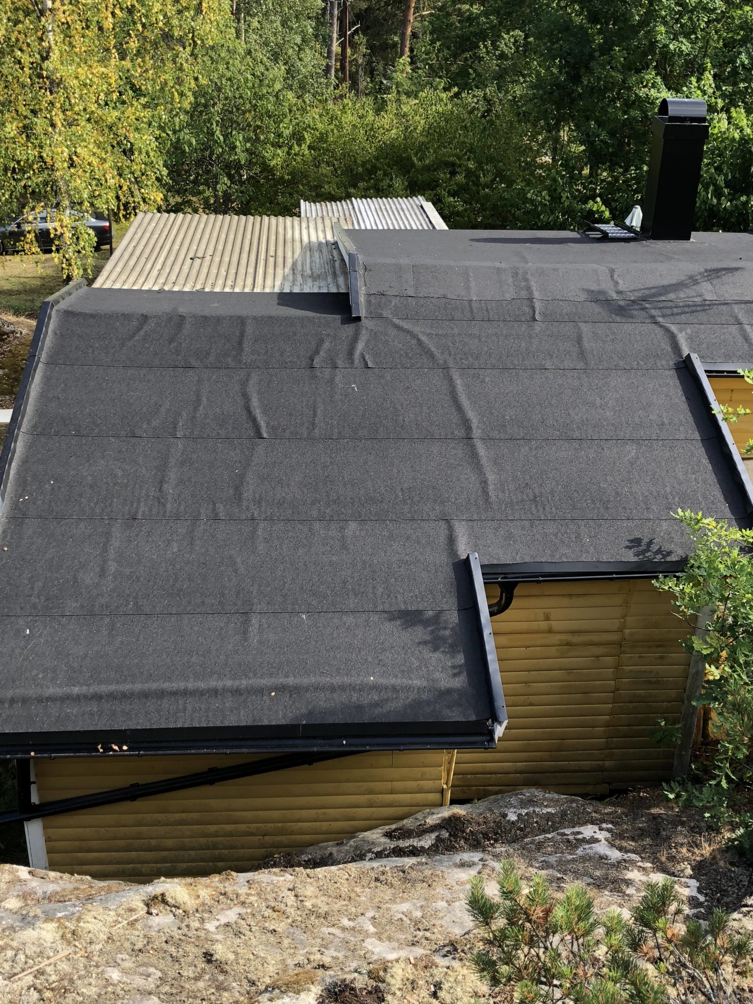 Vi fick taket på vårt fritidshus omlagt i höstas och nu när jag inspekterar så är jag väldigt tveksam till en lösning de gjort. Det estetiska är inte viktigt men jag tar gärna emot synpunkter på tex bubblorna också. Men det som bekymrar är lösningen där taket är av olika längd i nederkant. Man har låtit pappen leda ned mot övre ändan på vindskivan. Plåten har man vikt ned men det är ju inte en tät plåtbetäckning. Tidigare låg korrugerad plåt på hela taket som täckte detta men efter läckage så byttes allt, inkl råsponten. Så hantverkarna har kunnat lösa detta på valfritt sätt. Jag har begärt att de kommer ut och tittar och det skall de göra men behöver litet argument eller helst förslag på hur man kan göra det bättre. Och helst en mer kreativ lösning än bara en uppmaning att ”gör om gör rätt”