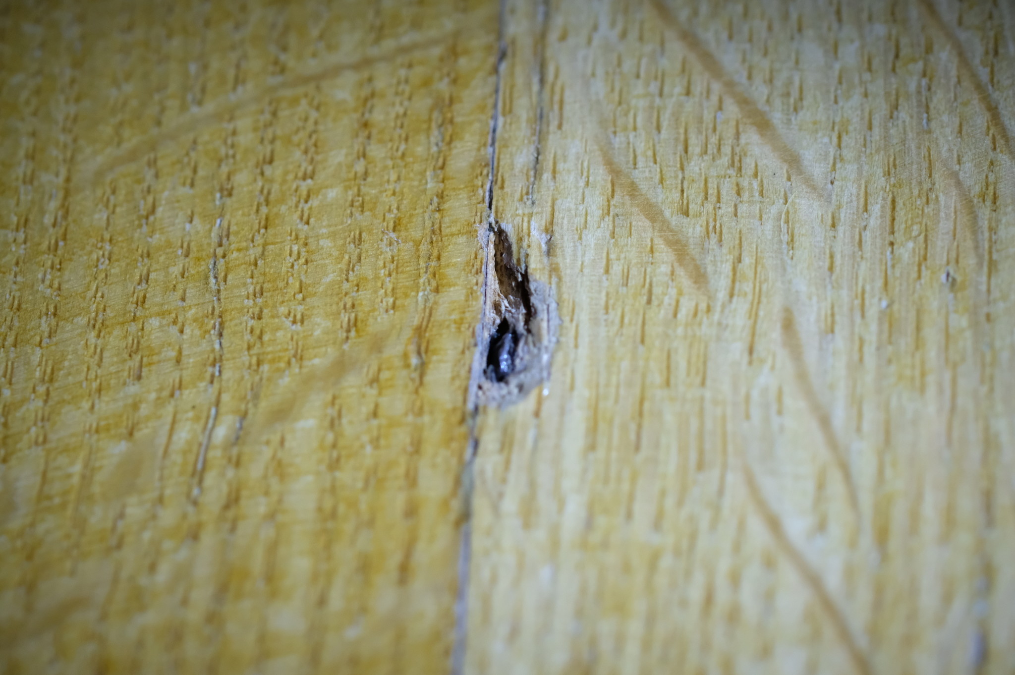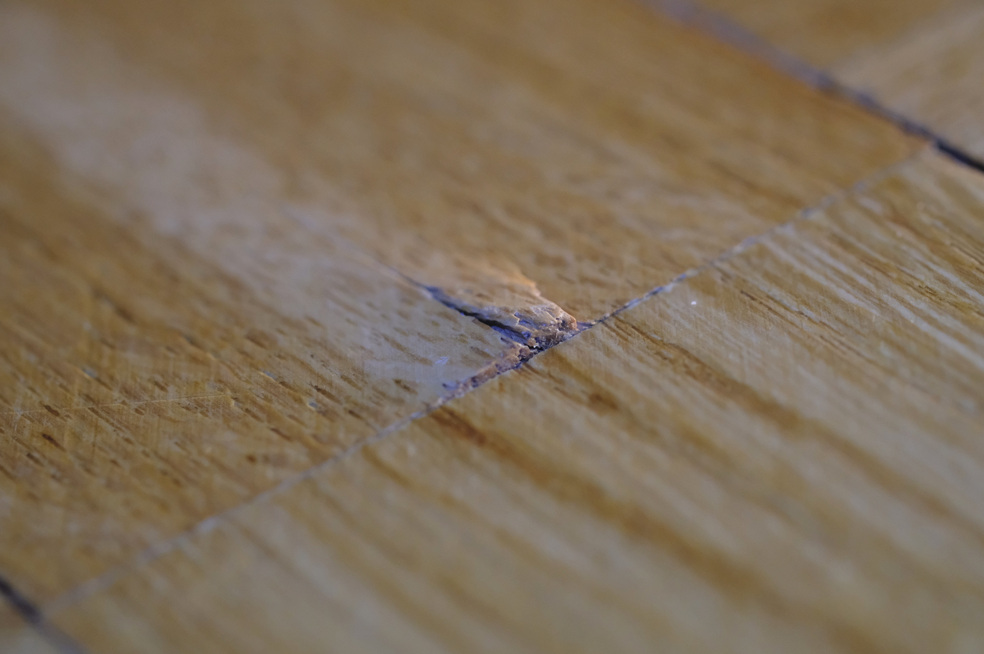 Är det bara att försöka banka ner metallspiken (eller vad det nu är), och sen lappa ihop med lite sånt där laga-golv-vax? Eller försöka limma dit flisan om man tror att det går.