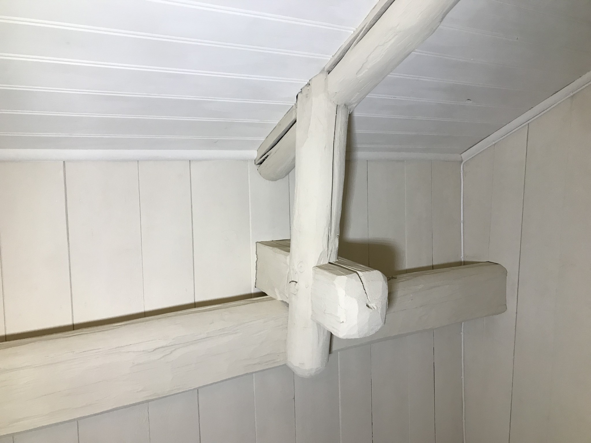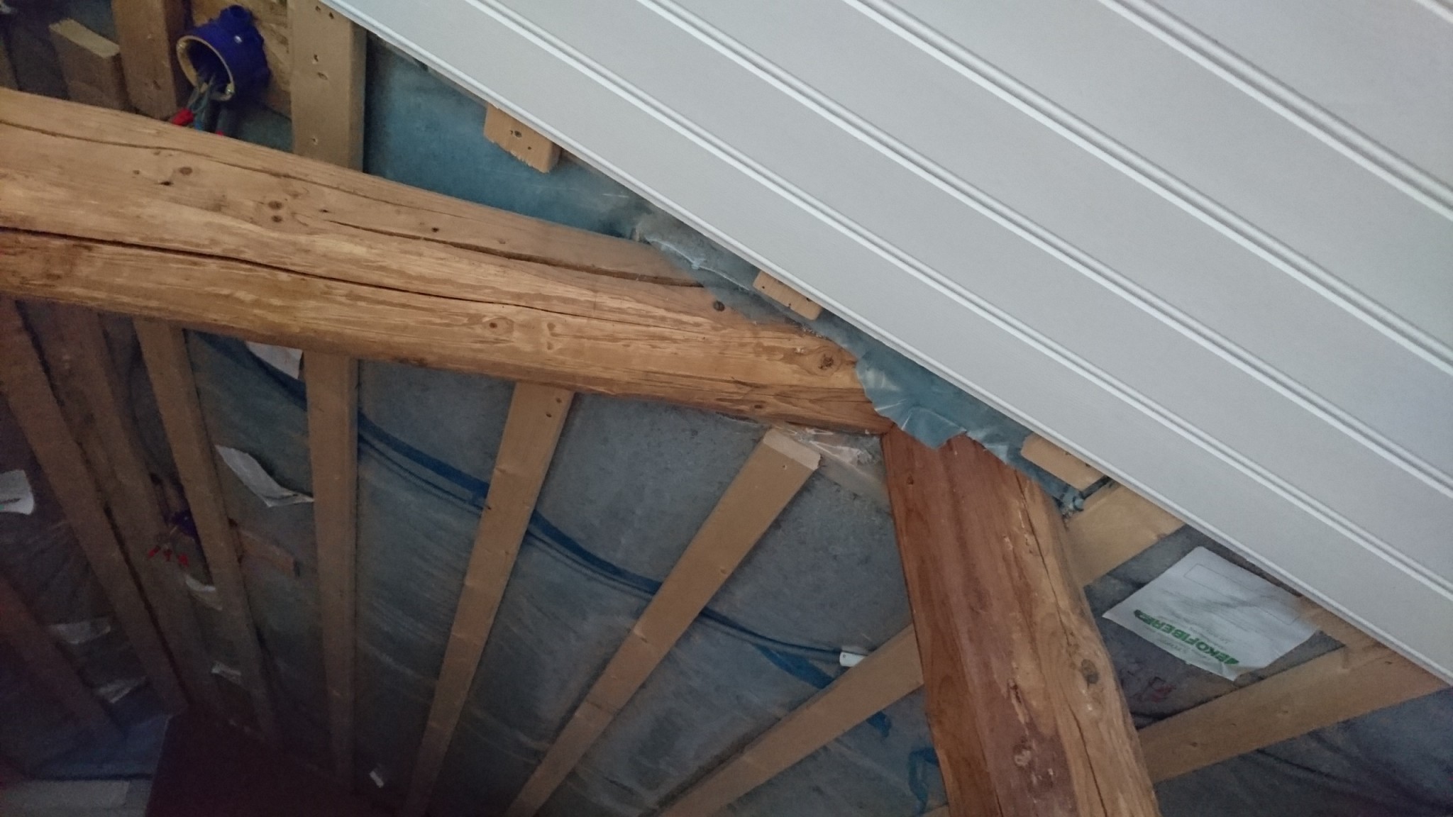 Har någon tidigare löst problemet jag har? Jag försöker sätta pärlspont i ett tak, så långt går allt bra, det är ett av måååånga tak i huset som fått pärlspont. Problemet är att jag här kommer till en gammal yttervägg och bjälkarna som hör till den gamla konstruktionen, som jag beslöt mig för att spara. Snyggt och coolt tycker jag. Nu ska jag bara sätta pärlsponten i taket...