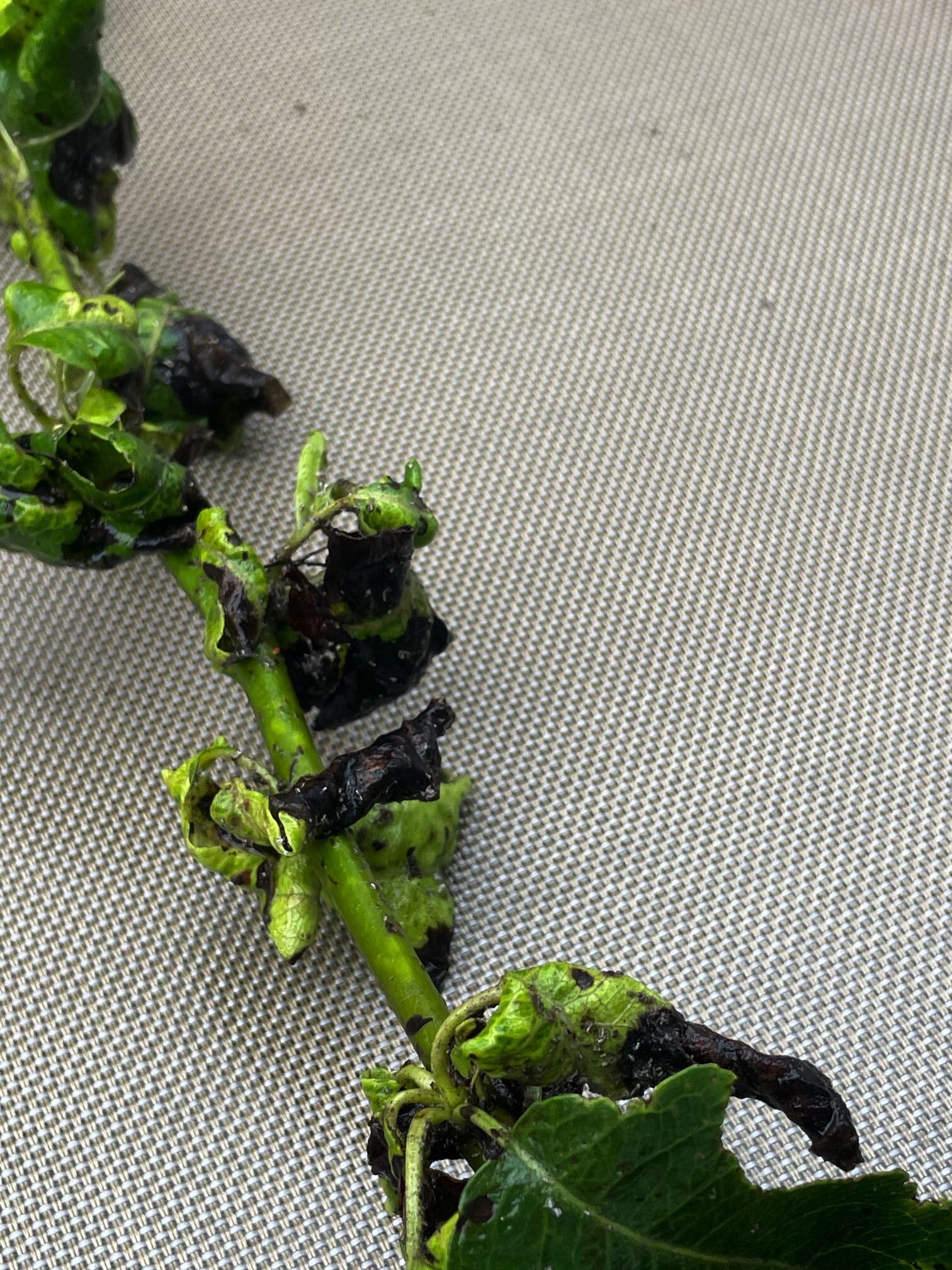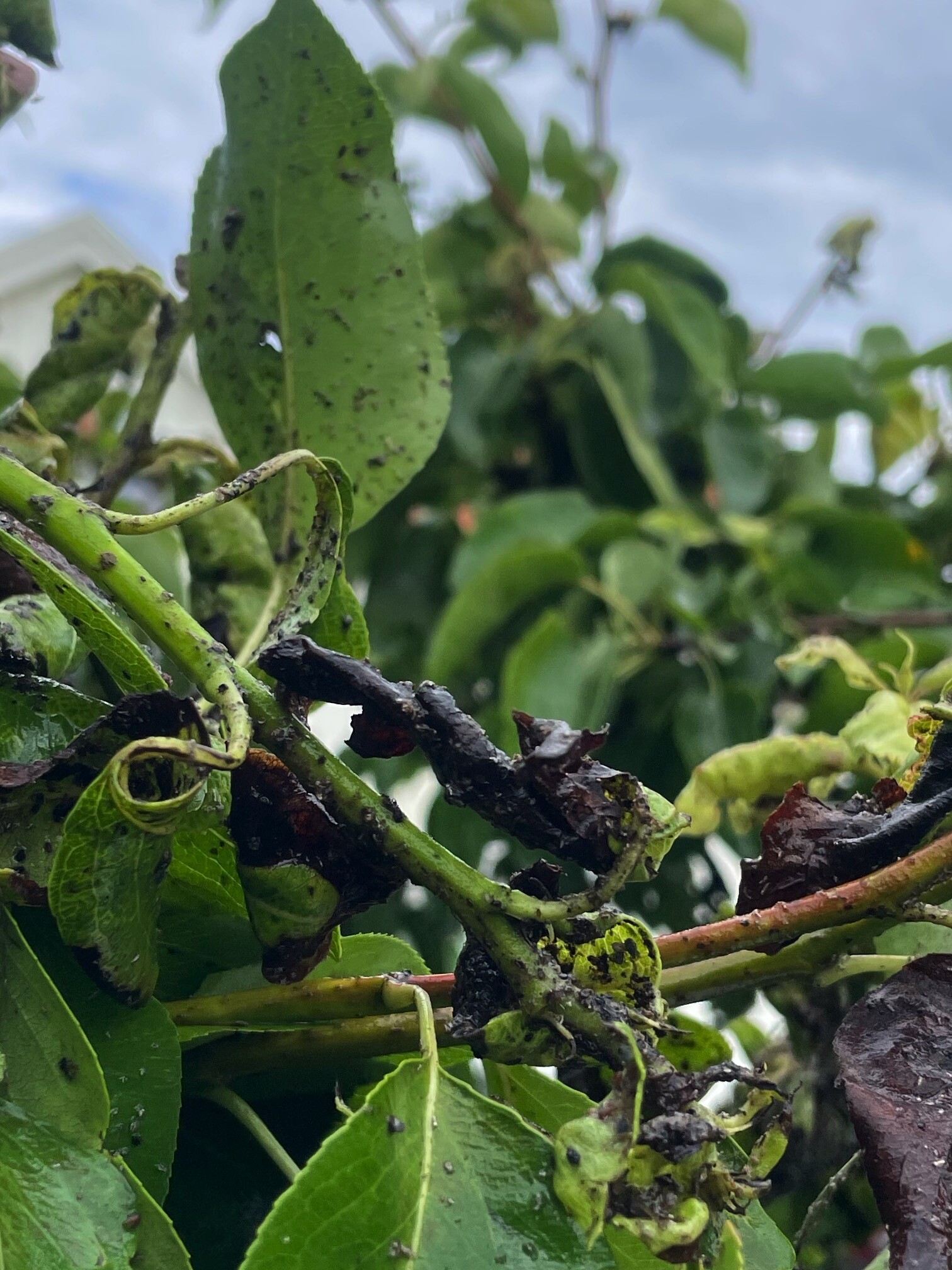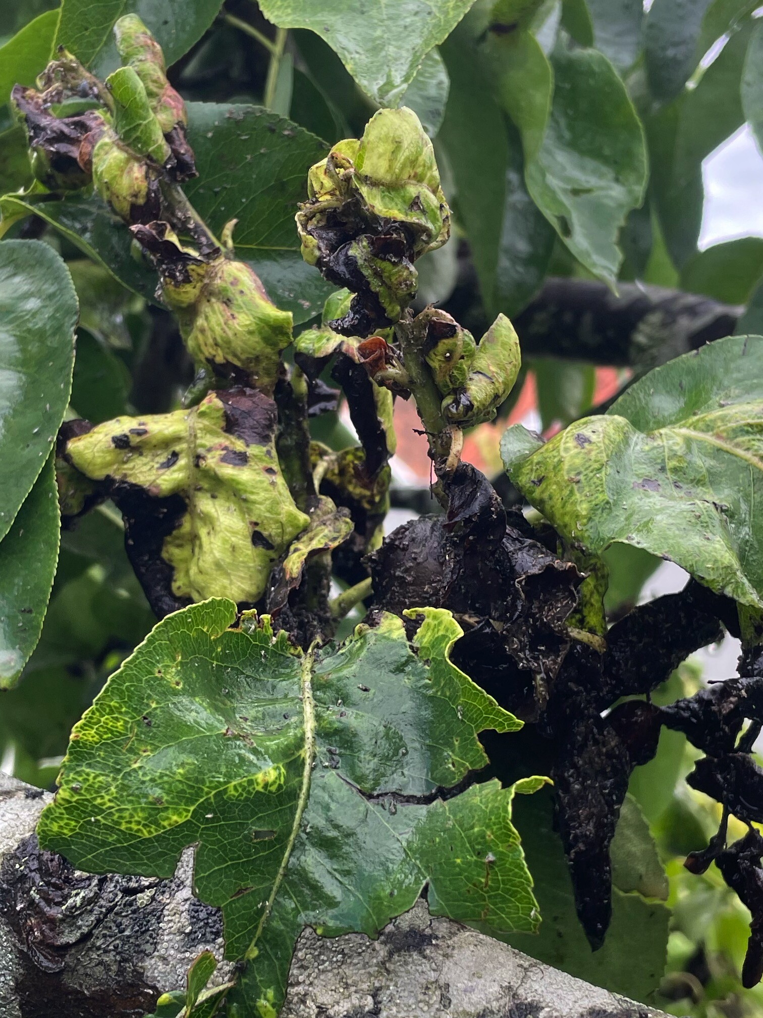 Vårt päronträd har totalt fallerat och många blad har krusat ihop sig och har svarta fläckar (se bilder) är även lite geggiga blad. under trädet där vi har träddäck är det ofta små svarta prickar från trädet, geggigt och även små korta typ strå/fjäll (supersmå). Ska inte säga att det är päls men påminner om liknande.