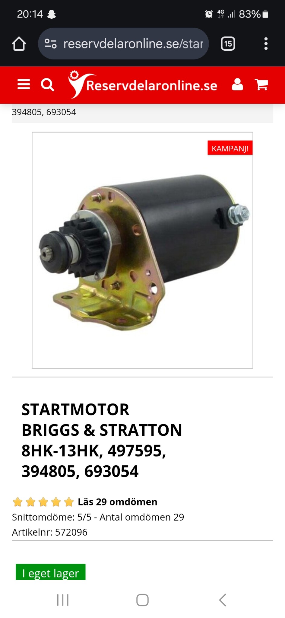 Partner 12-95E åkgräsklippare behöver ny startmotor, vilken passar?