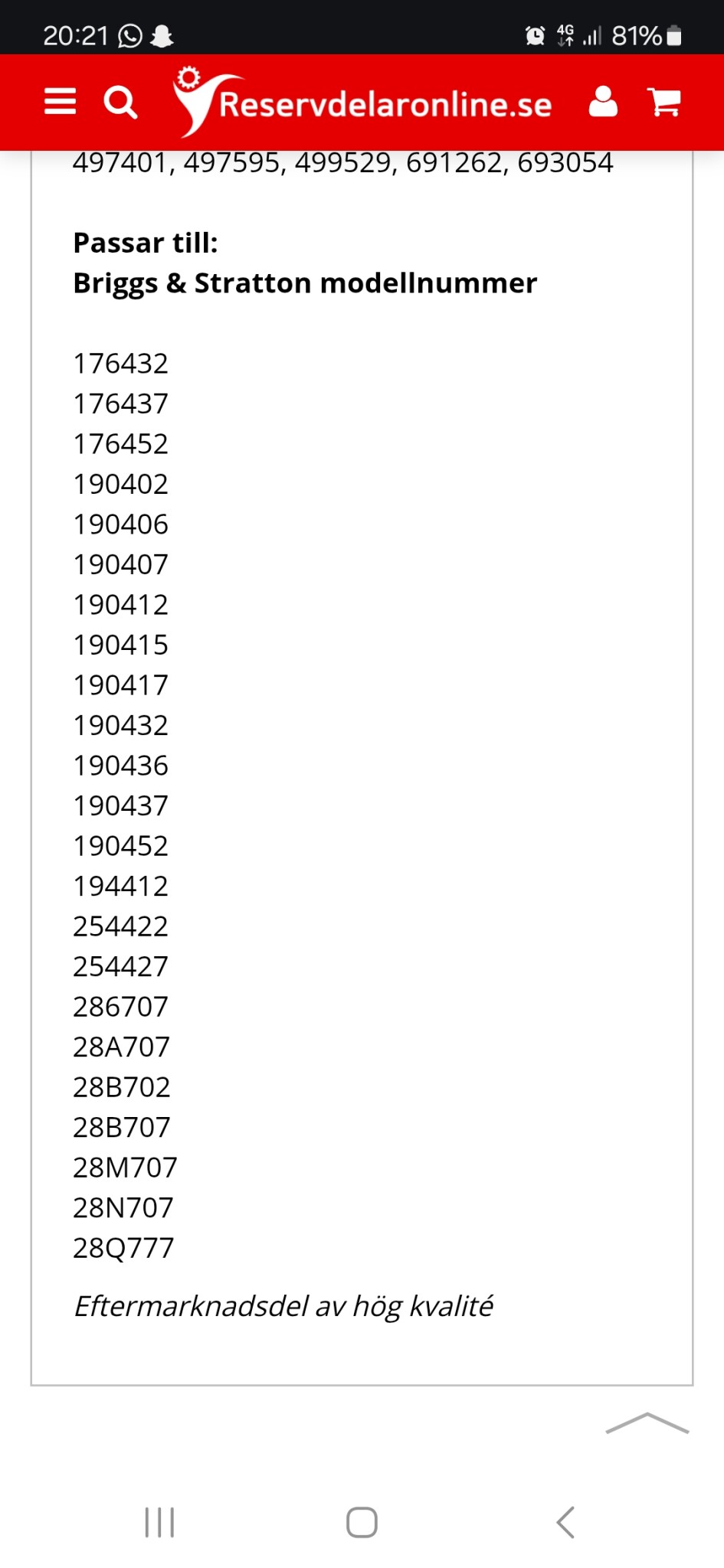 Det har du helt rätt i! Jag testar att beställa hem delen. Det värsta som kan hända är väl att den inte passar.A Avemo skrev:Som jag tolkar ref no 309 finns det tre olika som man kan särskilja genom att mäta längden. Men reservdelaronline anger ju samma del som ersättare till alla tre. Har man modellnumret till en Briggs & Stratton tycker jag att det brukar gå ganska bra att hitta reservdelar. I värsta fall går det väl att returnera.