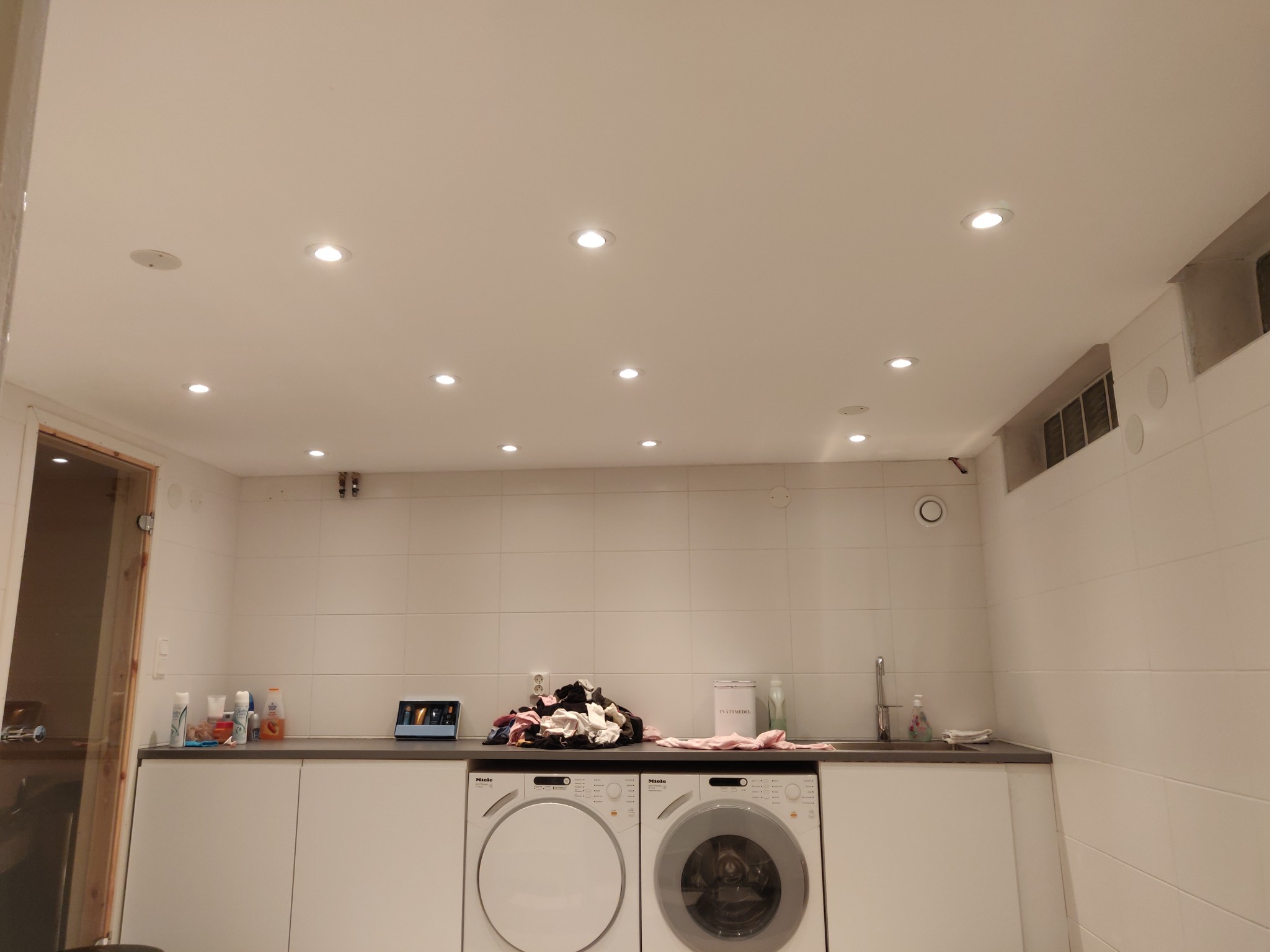 dvs 1,3st/m2. Dock lågt i tak eftersom det är källare. Det blir helt klart tillräckligt ljust för städning. Kanske till och med i överkant. Min fru brukar dimma ner en bit från max. Fördelen med dem är att de får plats med bara glespanel som nedregling.