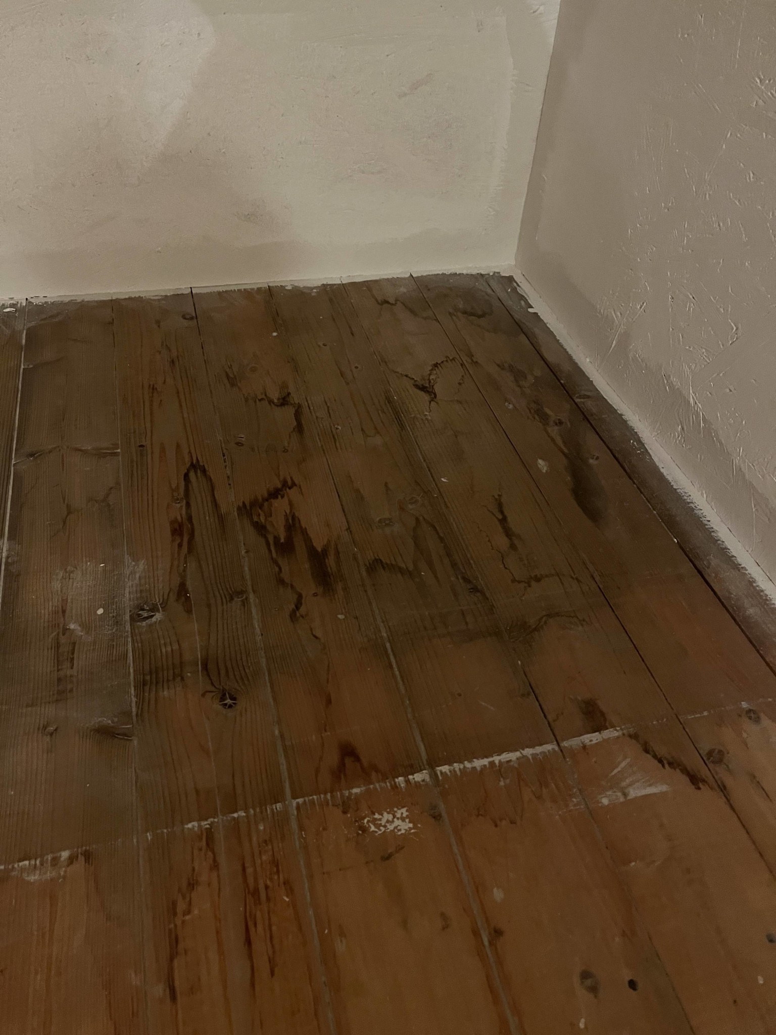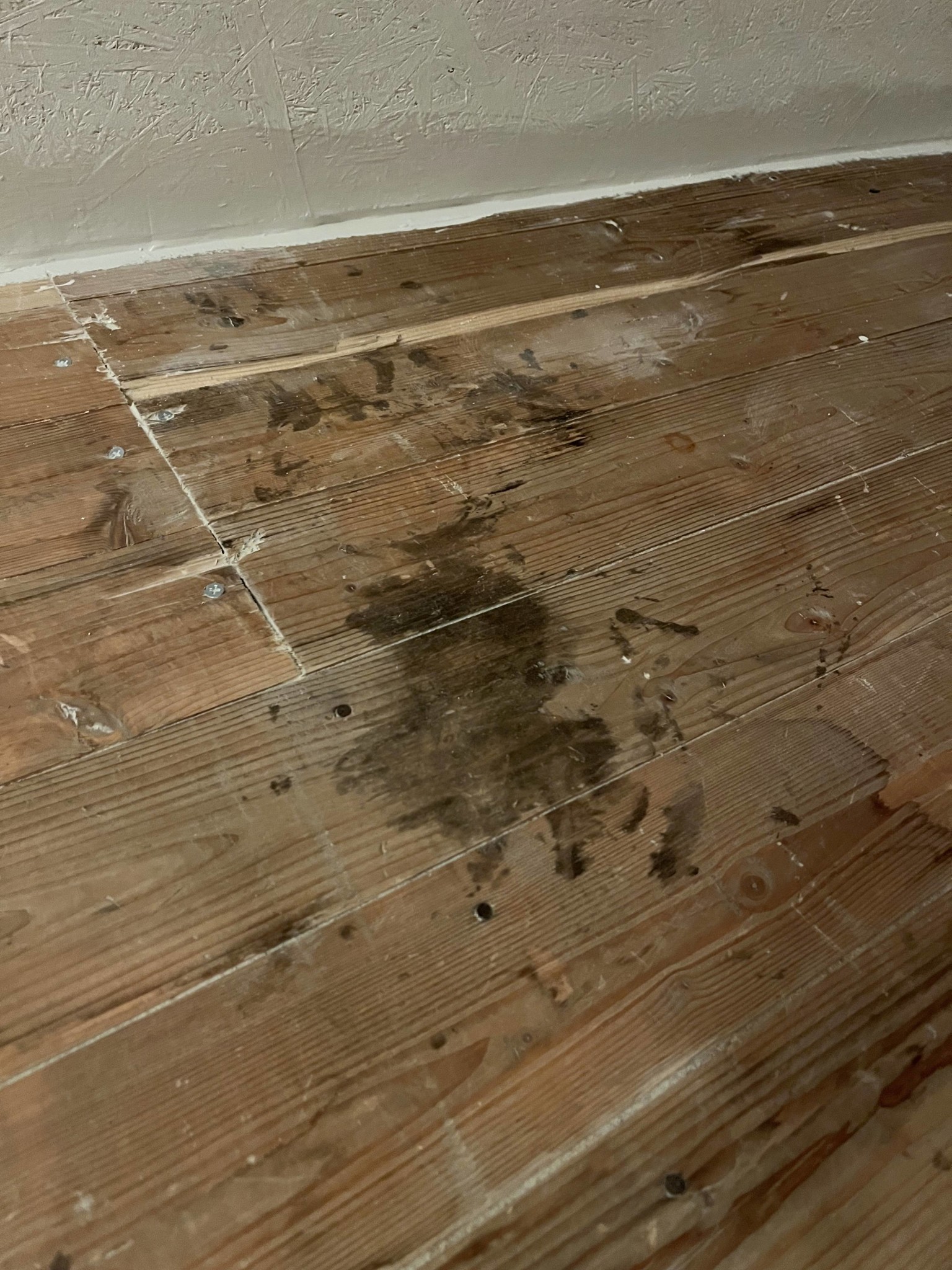 Jag tycker att det ser mer ut som att någon har spillt något och det har torkat in. Bild nr två har typiska ränder som det blir i kanten av spill som inte torkas upp direkt. Kanske taket som har läckt någon gång? Även vatten kan lämna fläckar och ränder på trä.