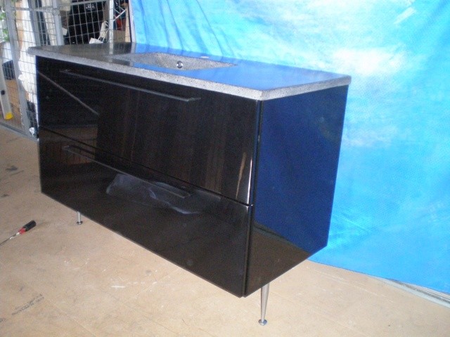 Det som ingår är en 120cm kommod med stenskiva samt ett högskåp med stenskiva. Både kommod samt skåp är högblank svarta.