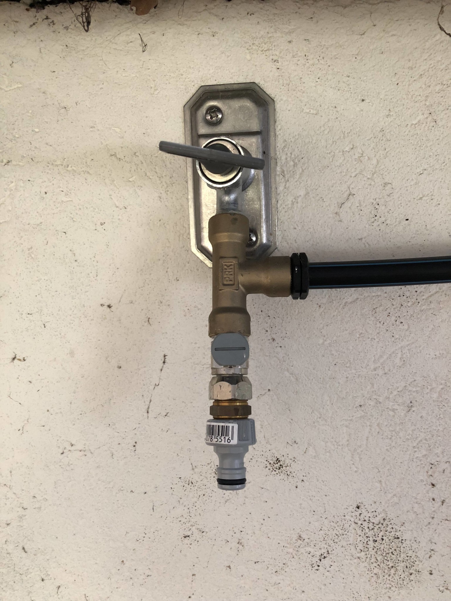 - Det andra utloppet ska mata en trädgårdsslang och behöver ha ett eget på/av-vred