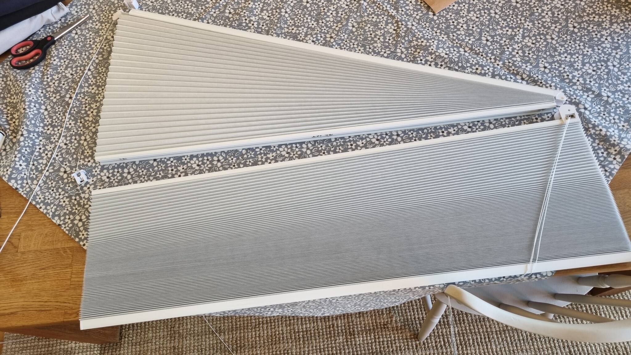 Hej! Har en gammal persienn enligt bild, där snöret som drar upp persiennen har gått av/knuten gått upp. Fönstret är i vinkel högst upp så persiennen har därför denna speciella form. Mekanismen för att dra upp den nedre delen av persiennen (den som bara löper rakt ner som en vanlig persienn) är intakt och fungerar, och är ju rätt logiskt uppbyggd med. Men den övre delen, som bara ska dra upp persiennen på ena sidan, förstår jag mig inte på. Och det är där snöret har gått av. Någon som vet hur snöret ska löpas? Får inte längden att stämma på snöret som är kvar heller, hur jag än måttar upp att det ska sitta.