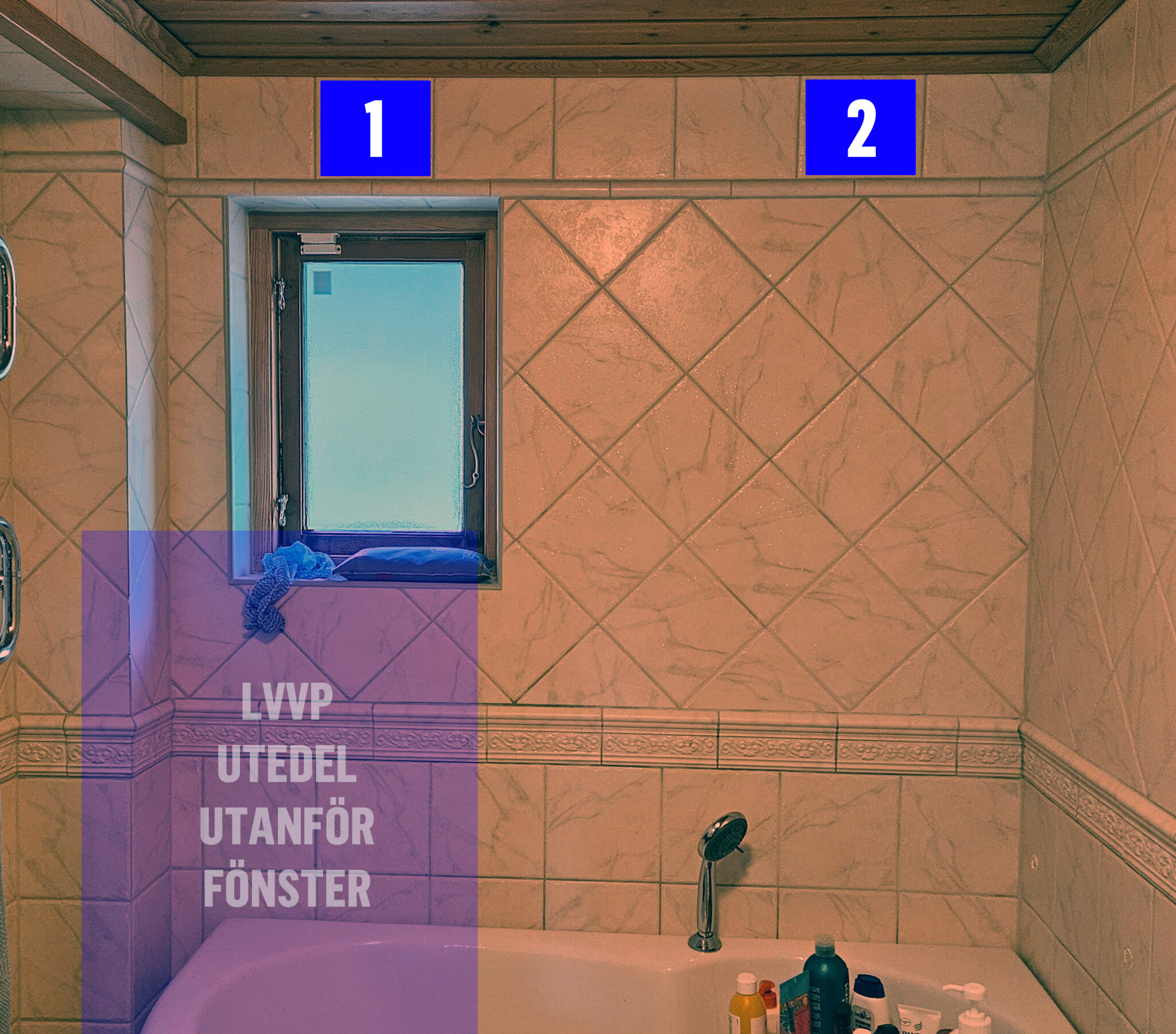 Därför funderade jag på att placera fläkten på position 1 i bilden, dvs över fönstret. Men... utanför fönstret står vår fläkt (utedel) tillhörande en luftvattenvärmepump (IVT AirX 407S) som är ungefär där markeringen i bilden är (utanför fönstret förstås). Den når upp till fönsterblecket i princip.
