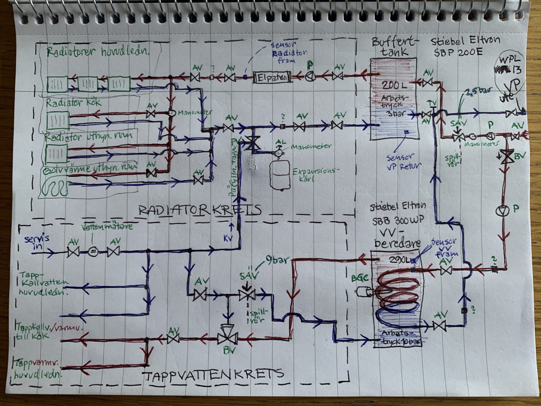 Jag har försökt göra ett flödesschema över värmesystemet och skrivit lappar på rören, så jag ser vad som är vad. När jag gjorde detta blev jag lite konfunderad över att det inte satt en säkerhetsventil vid expansionskärlet!?