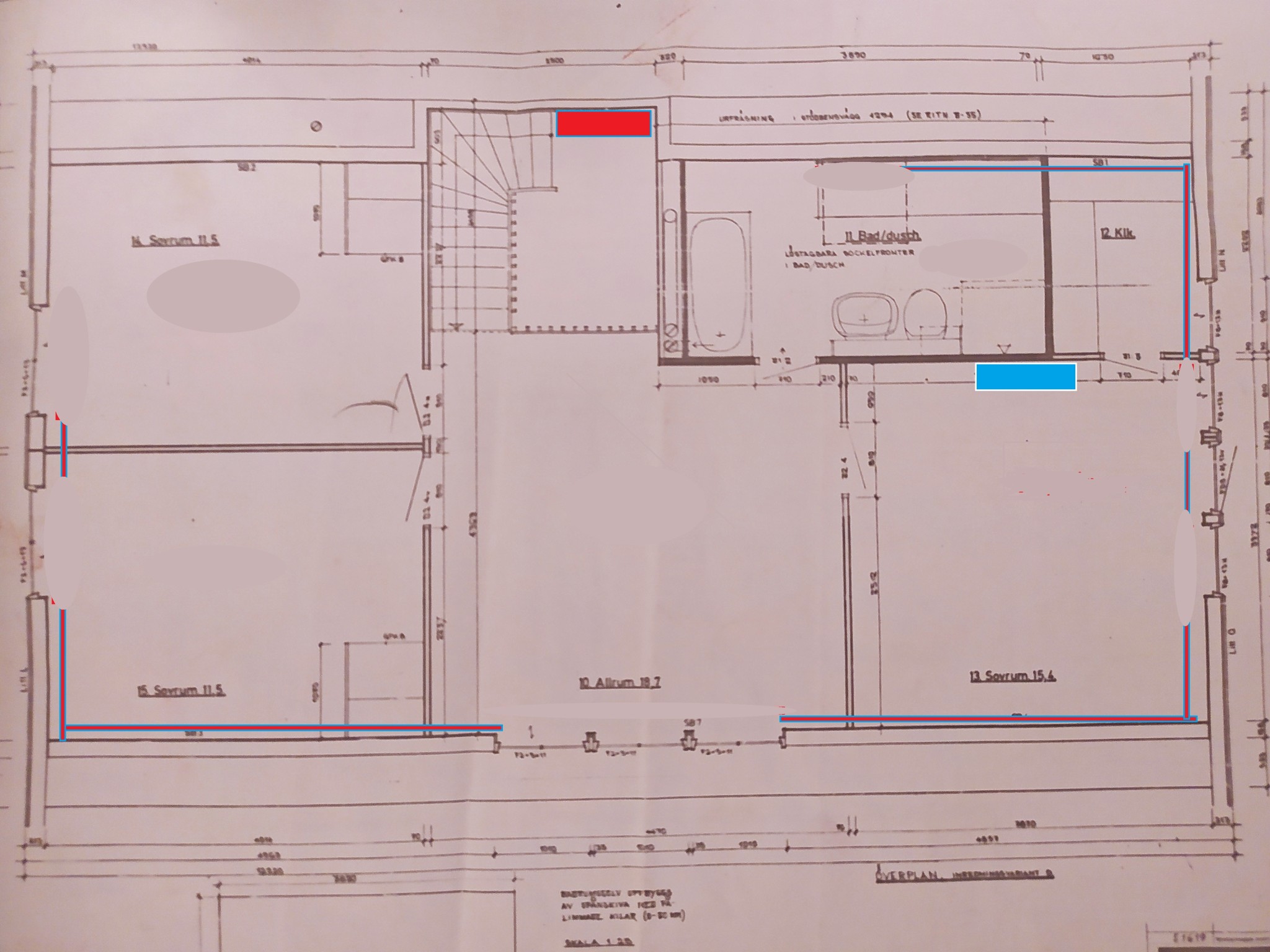 Planlösning övervåning: (Röd: pump nedervåning i hall) (Blå: tänkt placering sovrum)