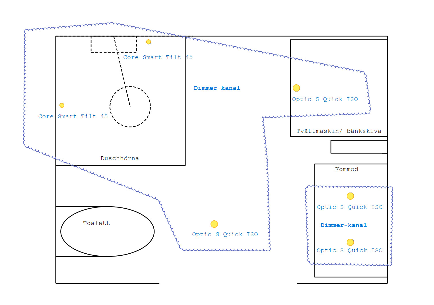 Vi har tänkt 4st Optic Quick ISO 2700k samt två Core Smart Tilt 45 till duchutrymmet, se bild för layouten. Vi har tänkt koppla spotlightsen till en Plejd Krondimmer Bluetooth LED DIM-02 som ska styras av kronströmbrytare med fjädrar. Vi har tänkt koppla 2st Optic Quick ISO som sitter vid spegeln till en kanal och resten till den andra kanalen. Funkar detta upplägg? Rummet är ca 2x2 meter.