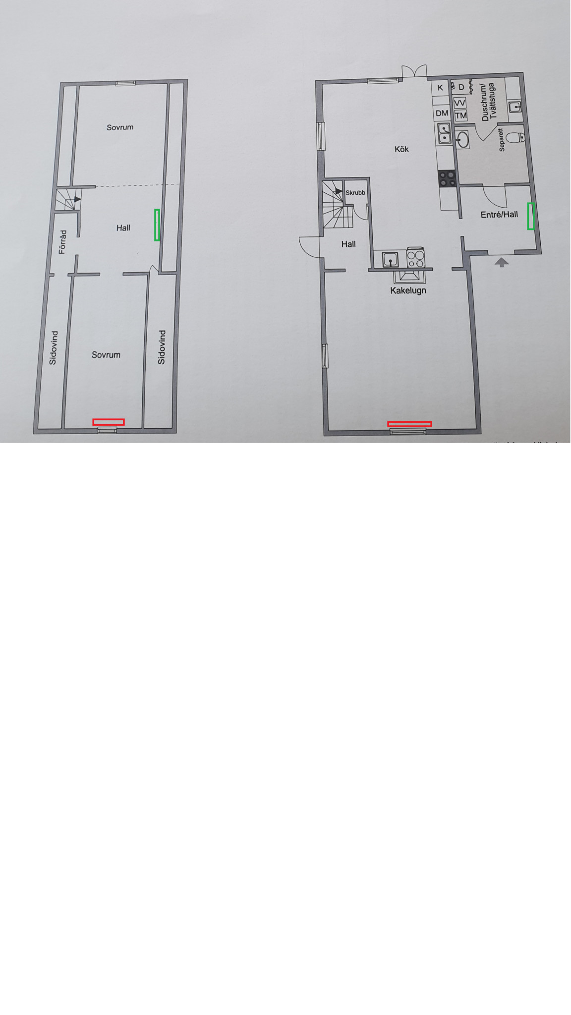 Den röda markeringen är där vi tänker att innedelarna kan sitta. Alternativt sätta dem enligt de gröna markeringarna. Förslaget från firman med en innedel är att sätta den i vardagrummet på nedervåningen vid den röda markeringen.