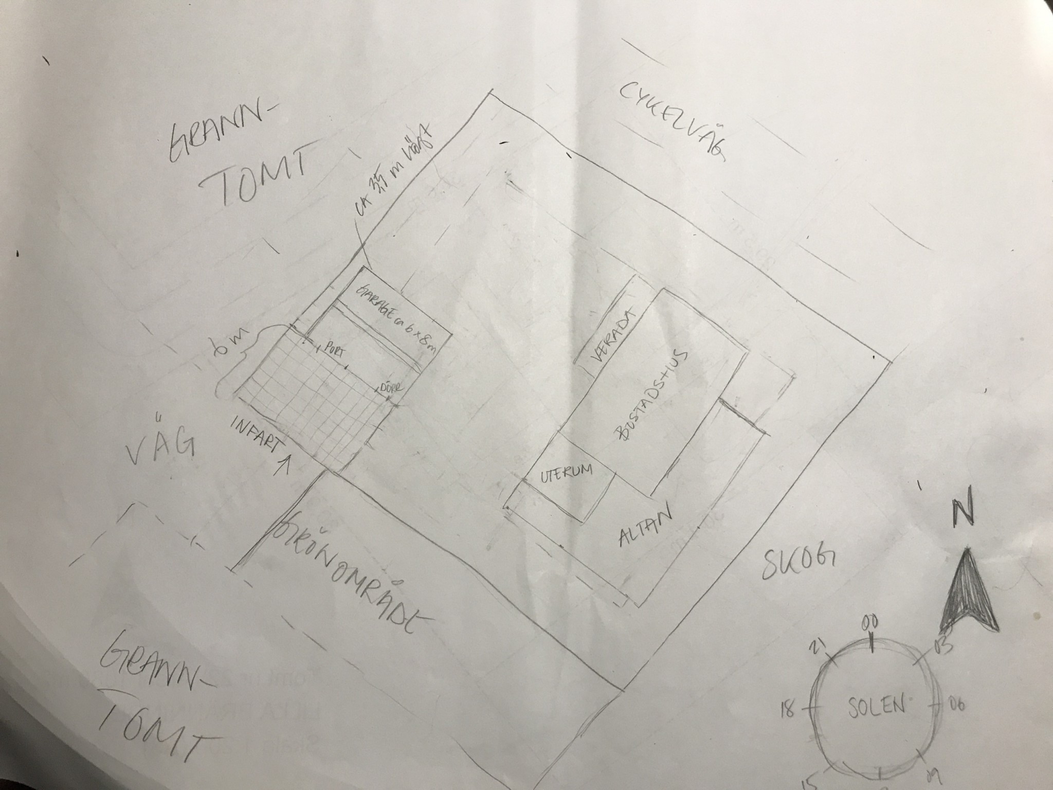 På den där tomten skulle jag föreslå huset parallellt med vägen. Ingång på långsidan in mot gården det vill säga mot sydväst. Då får vi veranda mot sydväst där ni kan njuta av vackervädret både vårar och höstar. Mitt i hetsommaren är det bara att gå några steg längre och sätta sig i skuggan av ett träd.
