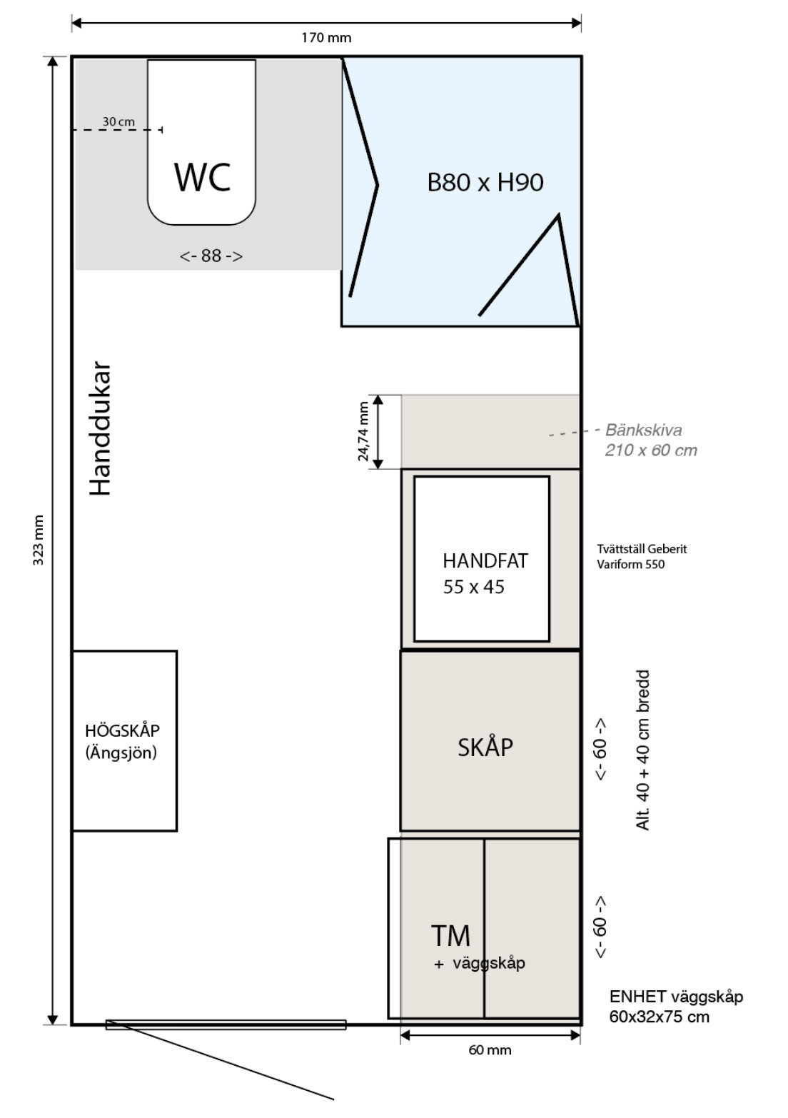 Jag både skrev TM på första ritningen (glömde det på slutliga ritningen, dock ser ni en bild på tvättmaskin), vi har dragit el för tvättmaskin och då pratat om det vid flera tillfällen på plats i badrummet.