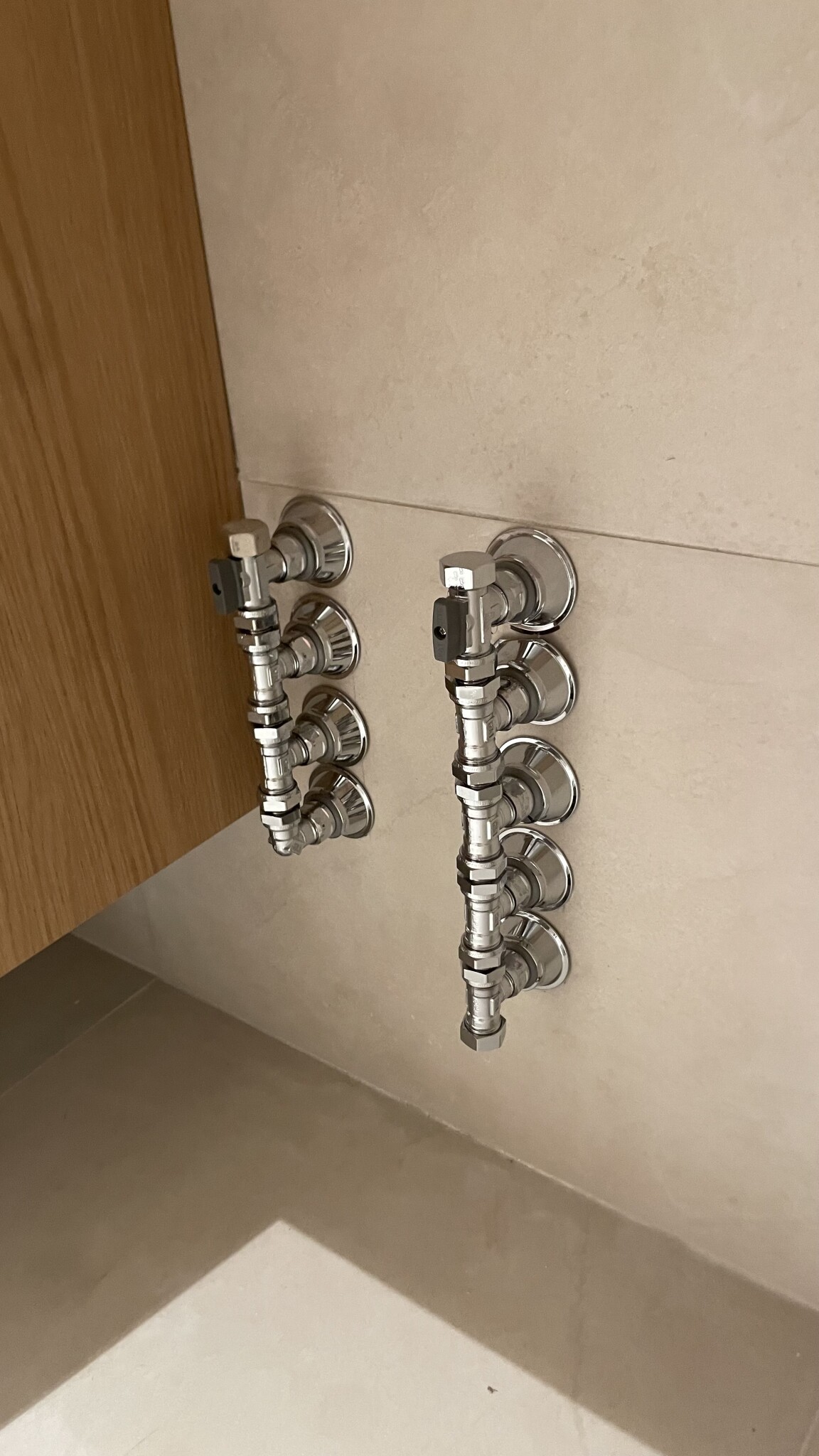 Byggfirman som håller på att göra vårt badrum har lagt rören här där tvättmaskinen skulle vara. Hela väggen var ju öppen. Borde de inte ha placerat kopplingarna där kommoden är istället? De fick ritning från början där tvättmaskin är inkluderad under bänken.