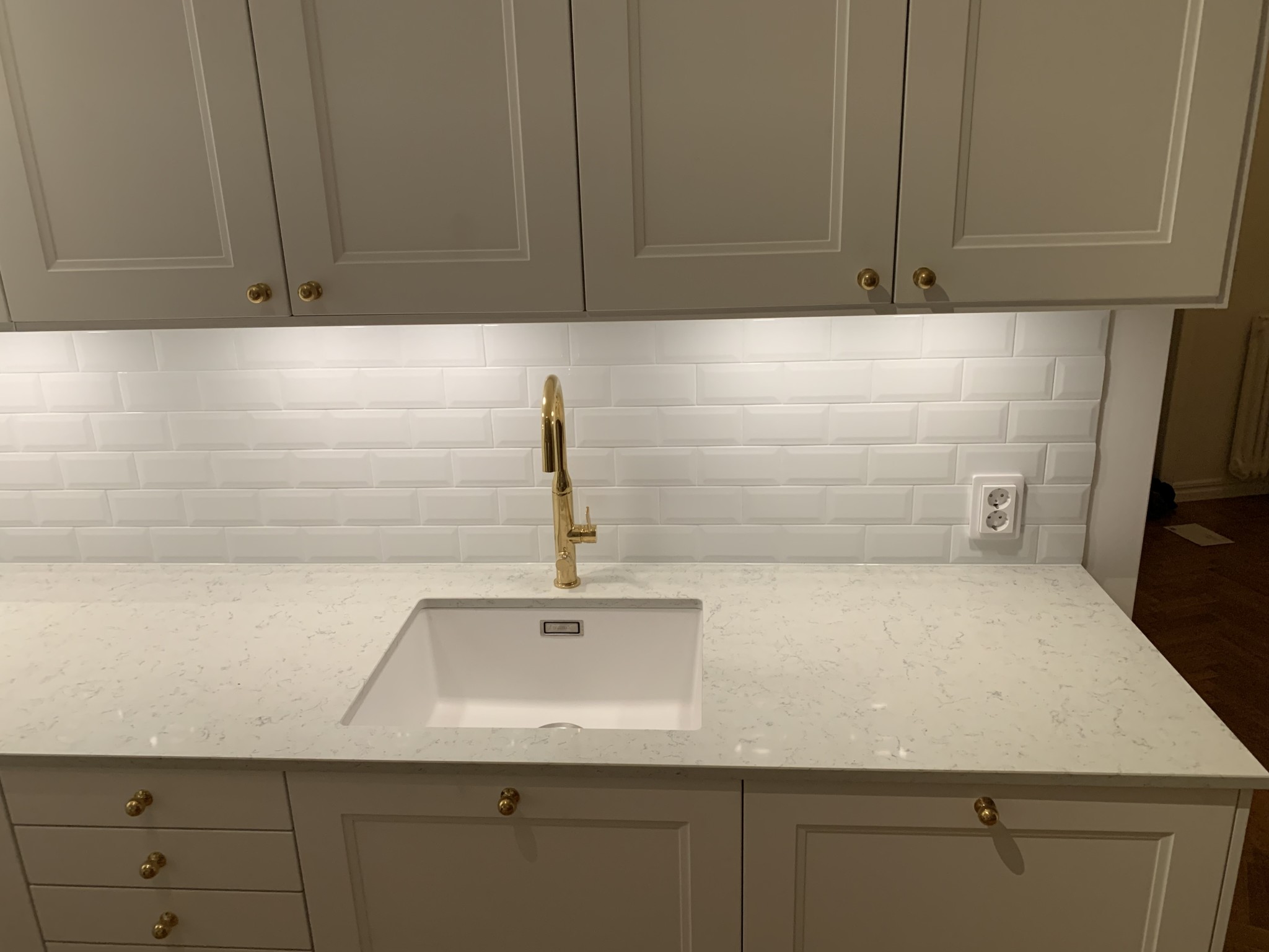 Blev jättesnyggt! Håller med en tidigare talare om att det linjerar snyggt med dom övre spottarna och markerar varje skåp på ett annat sätt. Finns absolut ingen anledning att reklamera det där.