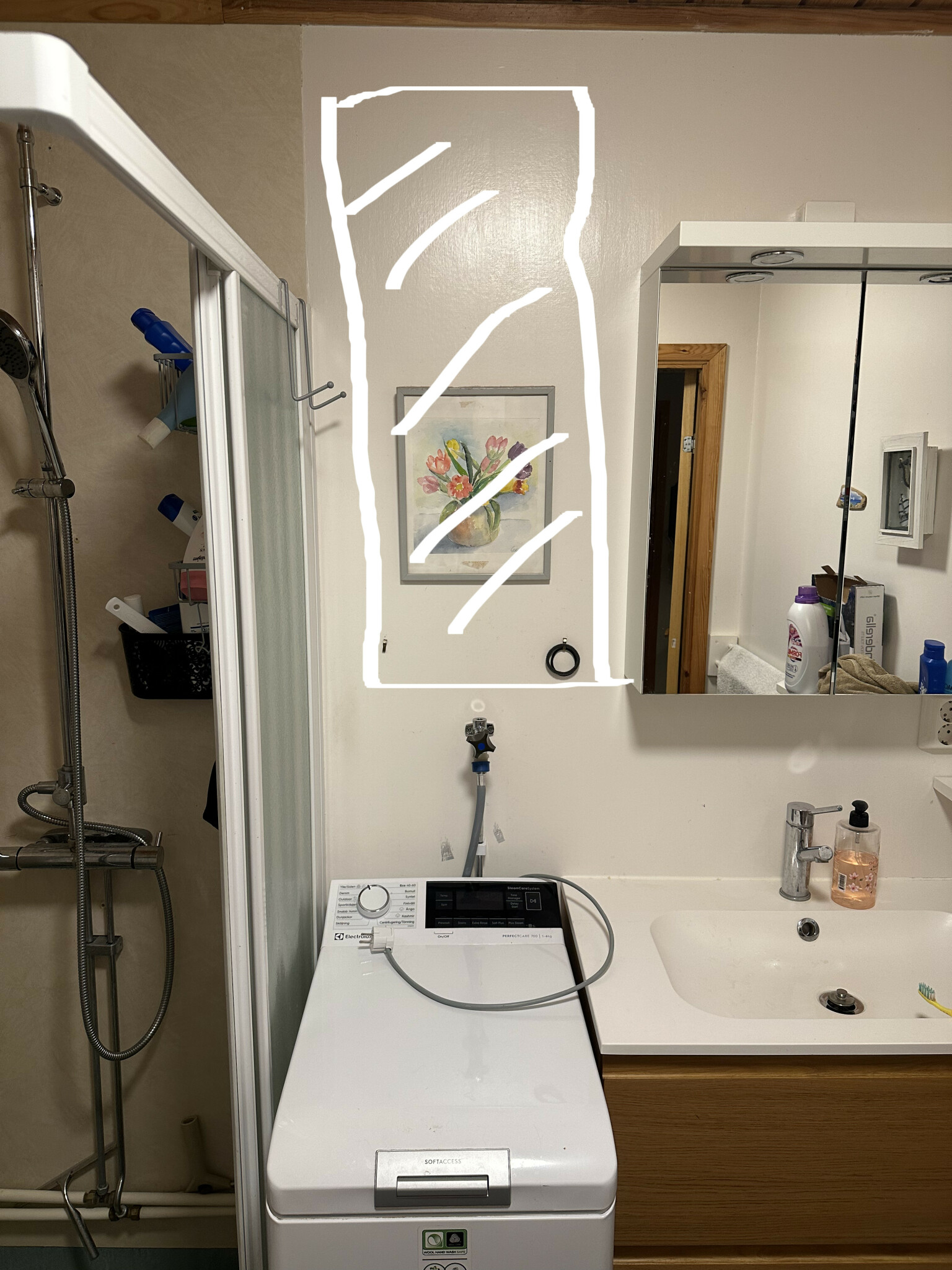 Nackdelen är att den skulle vara ovan tvättmaskinen, intill duschen och inte ha mer än 10cm fritt upptill och kanske 30-40cm nedtill fritt (tvättmaskinen kan så klart flyttas.