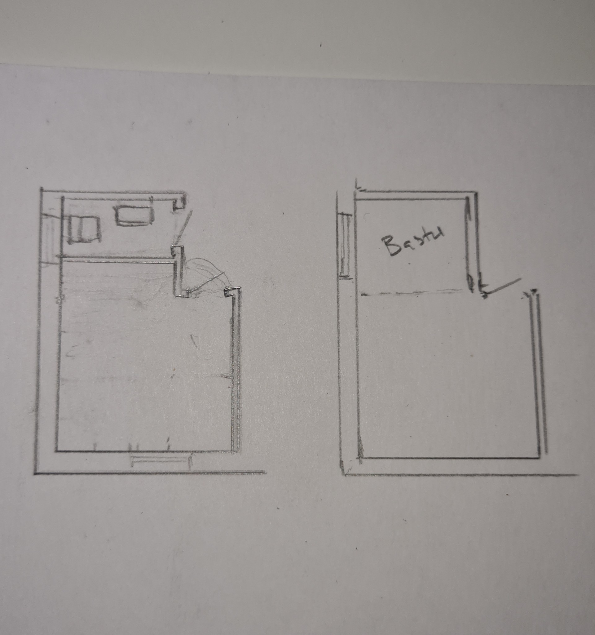 Har två principskisser där ena idén är att ha en egen toalett separerad från badrummet, och den andra är att använda nuvarande badrum ytan till att bygga bastu och sedan hela 'Rum' ytan till resten. Har dock ingen bra idé på hur toalett, dusch, tvättställ, badkar skall placeras för att det skall bli en bra planlösning i något av alternativen.