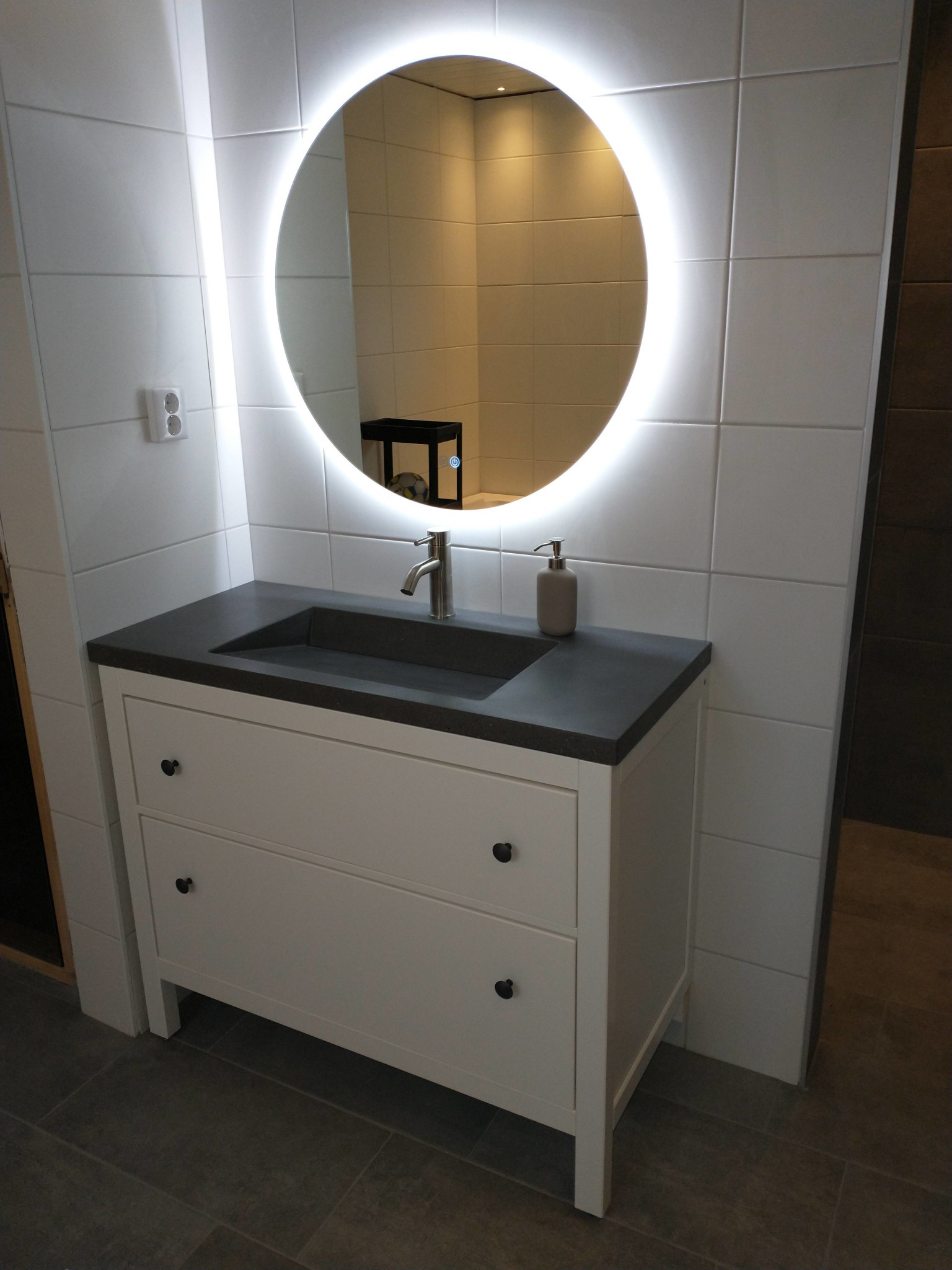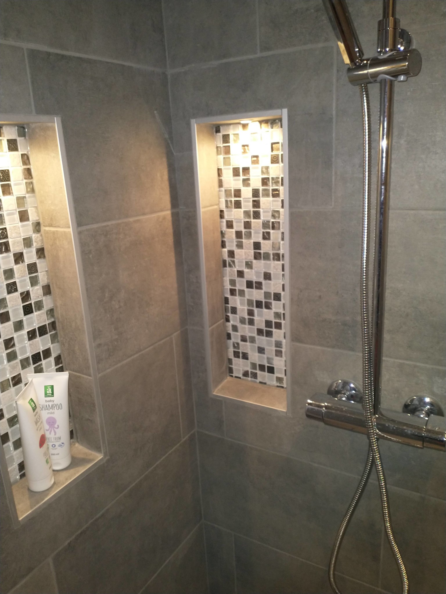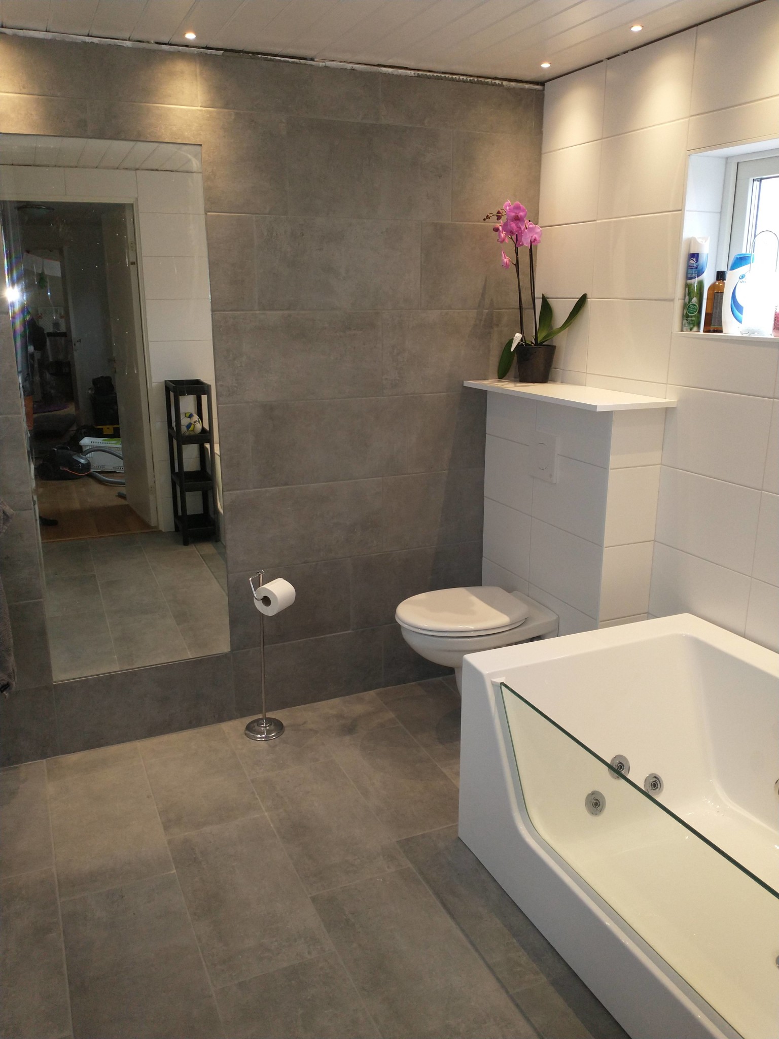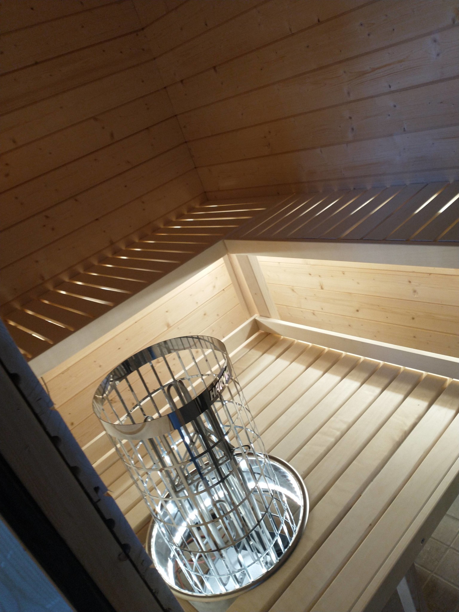Vi gjorde ett badrum med bastu med ungefär spegelvända förutsättningar. Har ingen planritning tillgänglig med ett par bilder som beskriver hur vi tänkte.