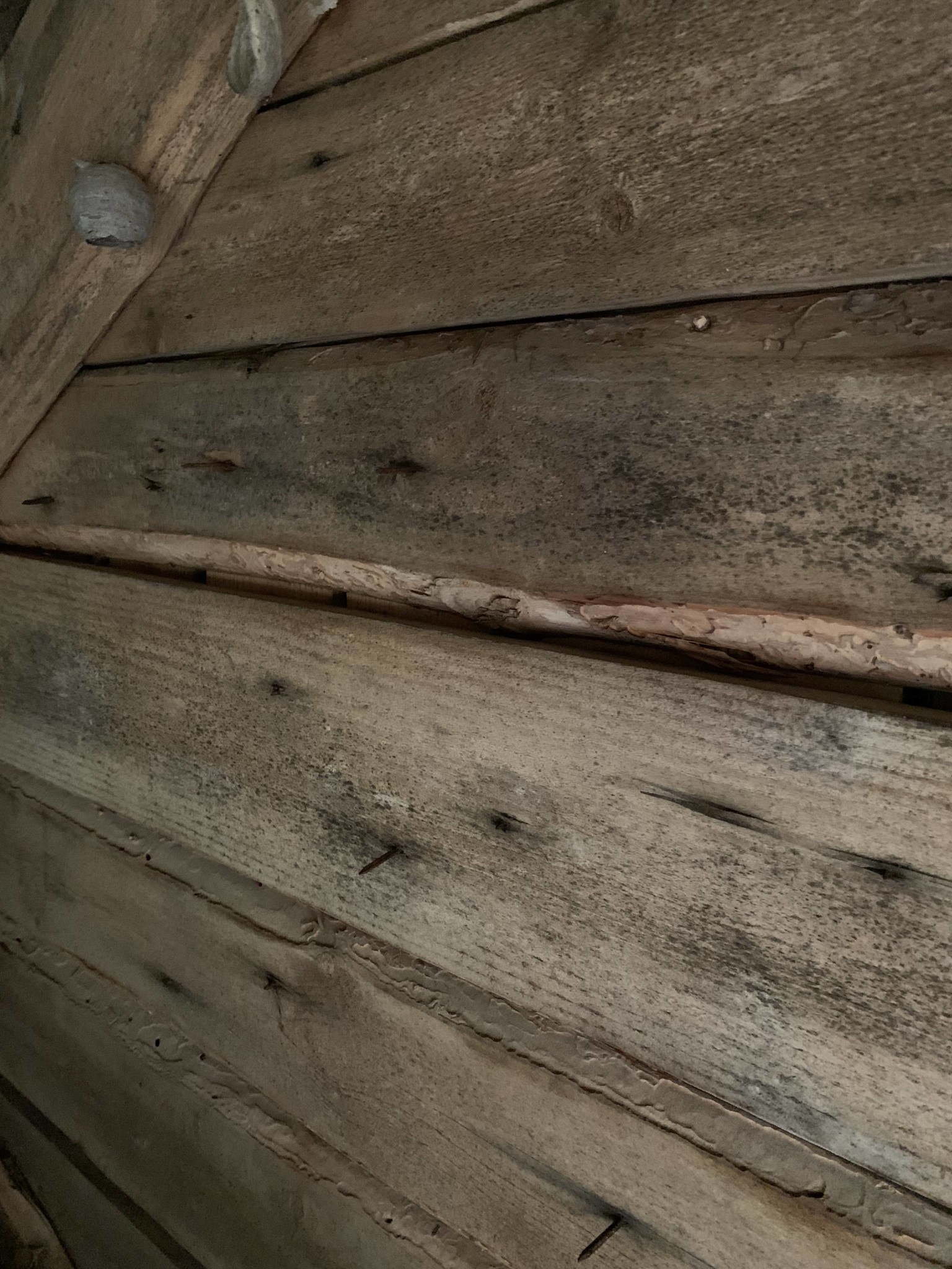 Hur som helst, som rubriken lyder är jag fundersam kring husstommen i huset jag ska ge mig in på att renovera. Det sägs att det är byggt av gammalt virke från tidigare bostadshus, och är byggt runt 1925. Så här ser det ut på gaveln på vinden, och om jag inte är helt ute och cyklar ser det ut som en plankstomme? Liggande plank på stående plank (kika noga mellan springorna så ser ni).