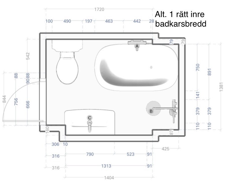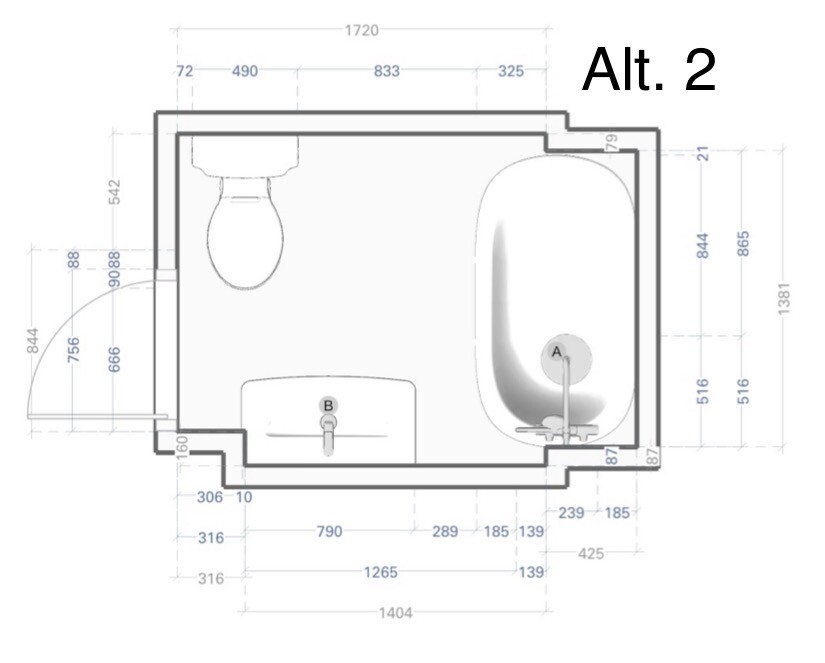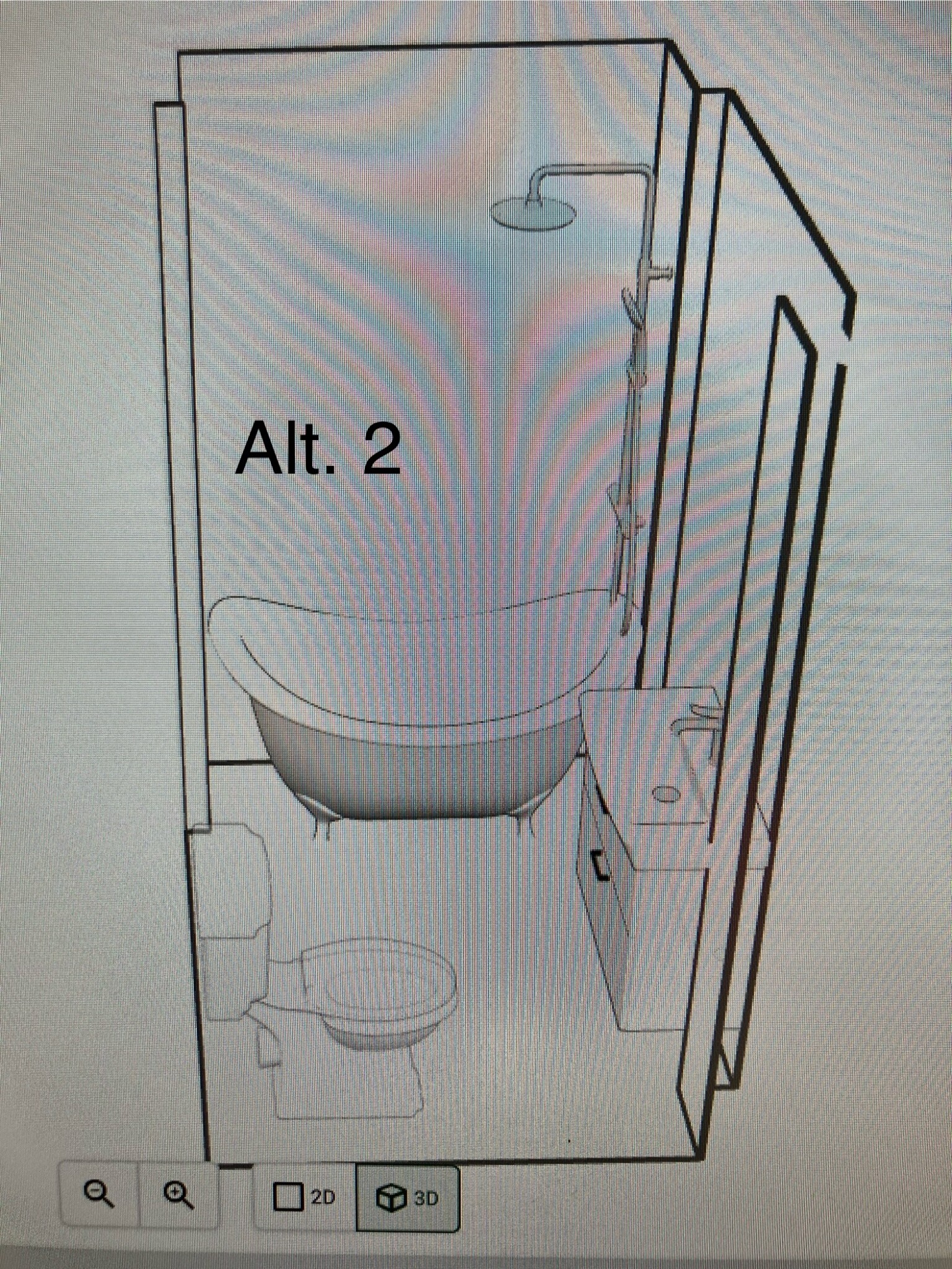 (2B: Får jag in badkaret? 138 cm på kritiska stället idag. Plan B att ev. dra ut det ca 10 cm från kortväggen och bygga upp en låg vägg där som blir hylla.)