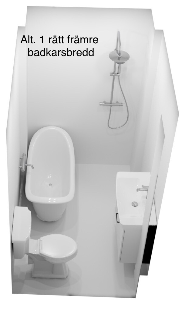 Alt. 1 Badkar långsida, separat dusch med duschdraperi runt dusch, troligen på takskena.