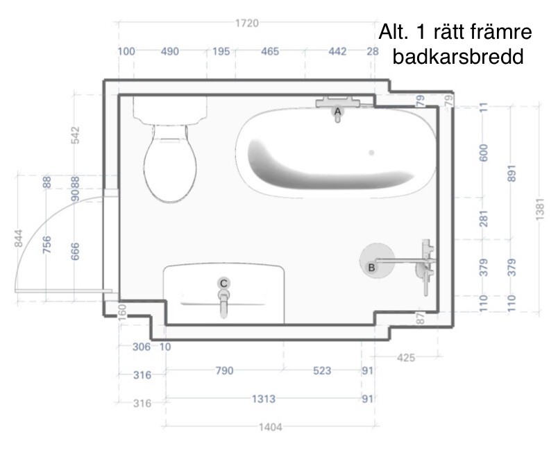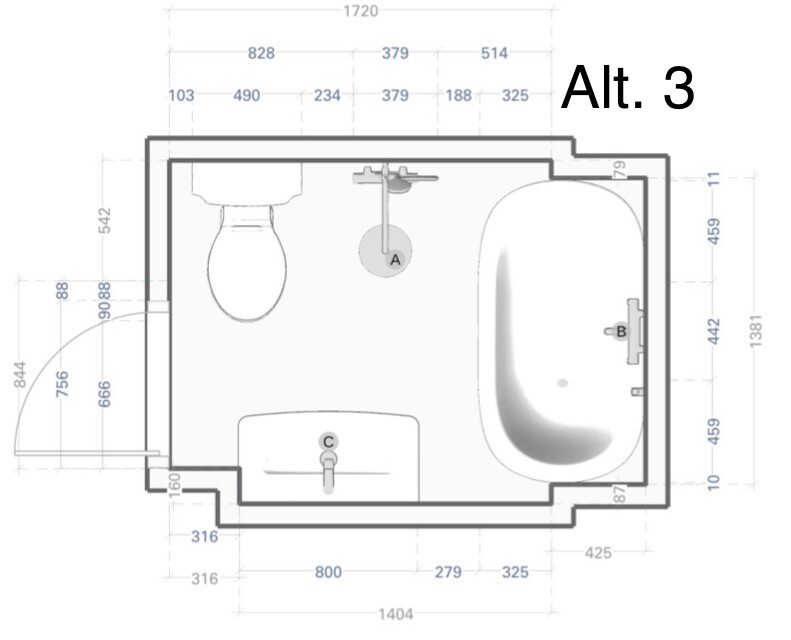 Stort tack för värdefulla svar och synpunkter! Jag uppfattar att du förordar alternativ 2 då alltså! (Annars funderade jag på en ev. möjlighet till handdukstork på dörrväggen, precis till vänster när man kommer in, innanför toaletten.BirgitS skrev: