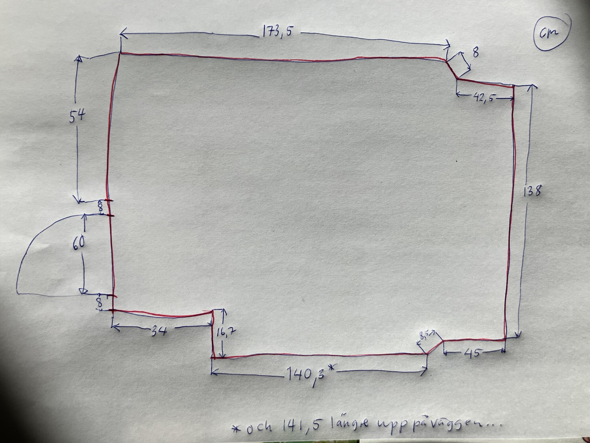 För rätt mått idag, se avfotad pappersritning (lyckades inte bli mer exakt i Spark Blueprint). Bl.a. är vänstra lång-/toaväggen 1,5 cm längre i verkligheten. Det är kaklade och väldigt ojämna väggar idag.