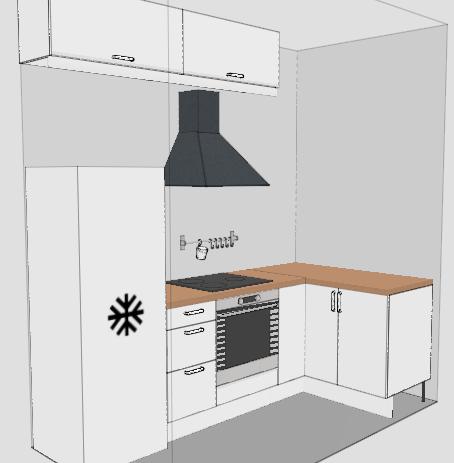 * En 60cm bred kyl/frys som till viss del även fungerar som skafferi skåpet ovanför sväljer resten (fler modeller 60-skåp än 55-skåp att välja från, ville ha ett i rostfritt och Gram-skåpet jag valde kan stå nästan dikt an mot väggen till höger utan att påverka hur kylskåpsdörren öppnas/fryslådorna dras ut)