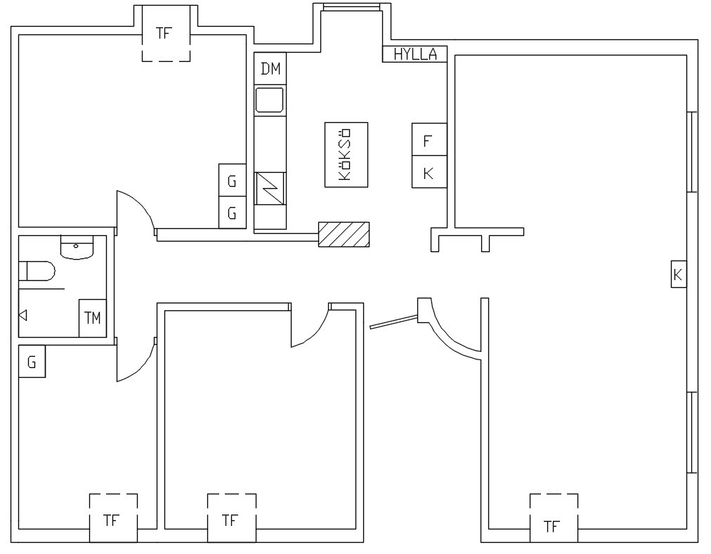 Mitt förslag - Flytta väggen mellan de två nedre rummen, så att de blir ungefär samma storlek samt dörren till det övre sovrummet.