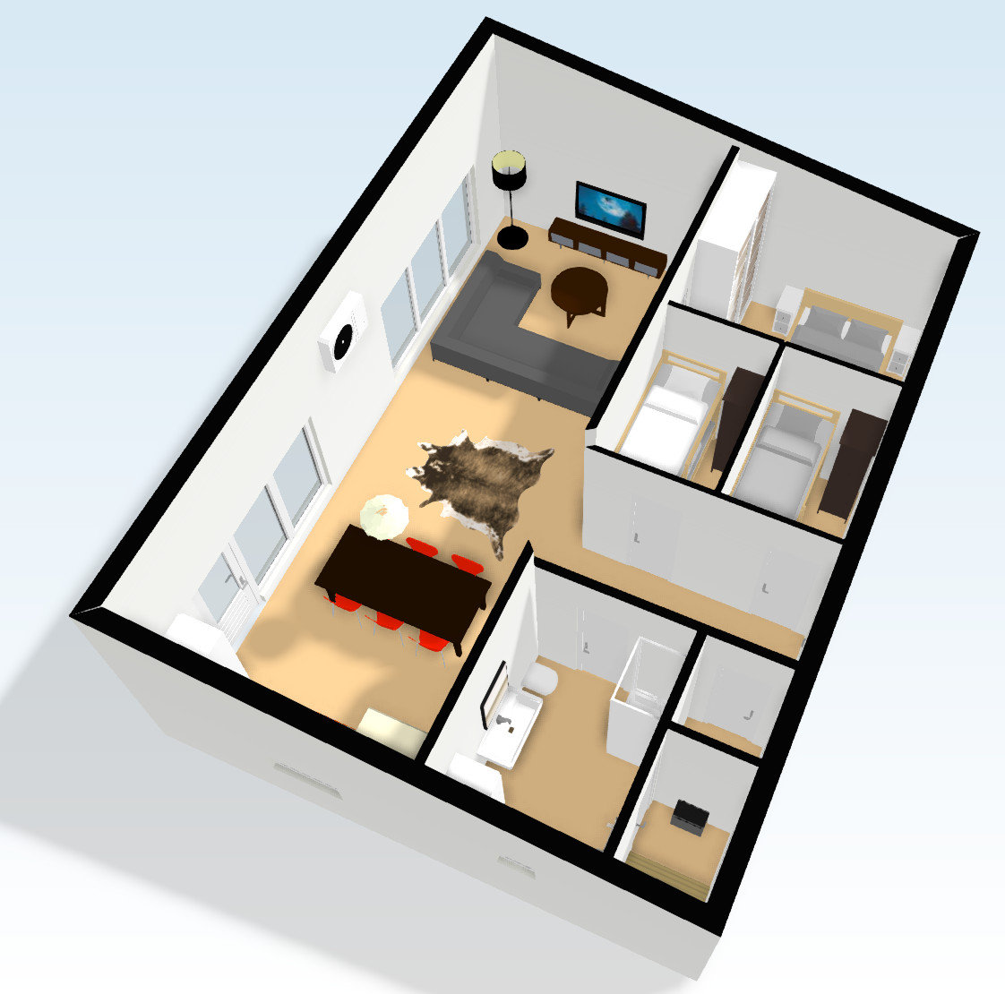 Det enda som inte är riktigt bra enligt mig är att ett av sovrummen blir utan ytterfönster. Så det får antingen bli ett takfönster eller ett högt placerat fönster in till andra intilliggande sovrum för ljusinsläpp.