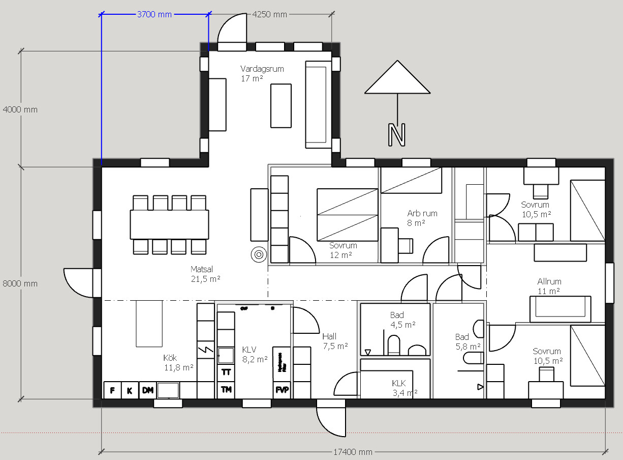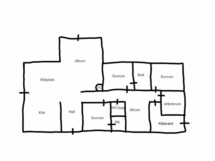 Viktigt för oss är 3 sovrum, arbetsrum och allrum. Viktigt också att kök och vardagsrum hamnar i ena änden med fönster i tre väderstreck pga tomtens utformning. Kök och vardagsrum får inte upplevas som ett enda stort rum, därav den lilla utbyggnaden.