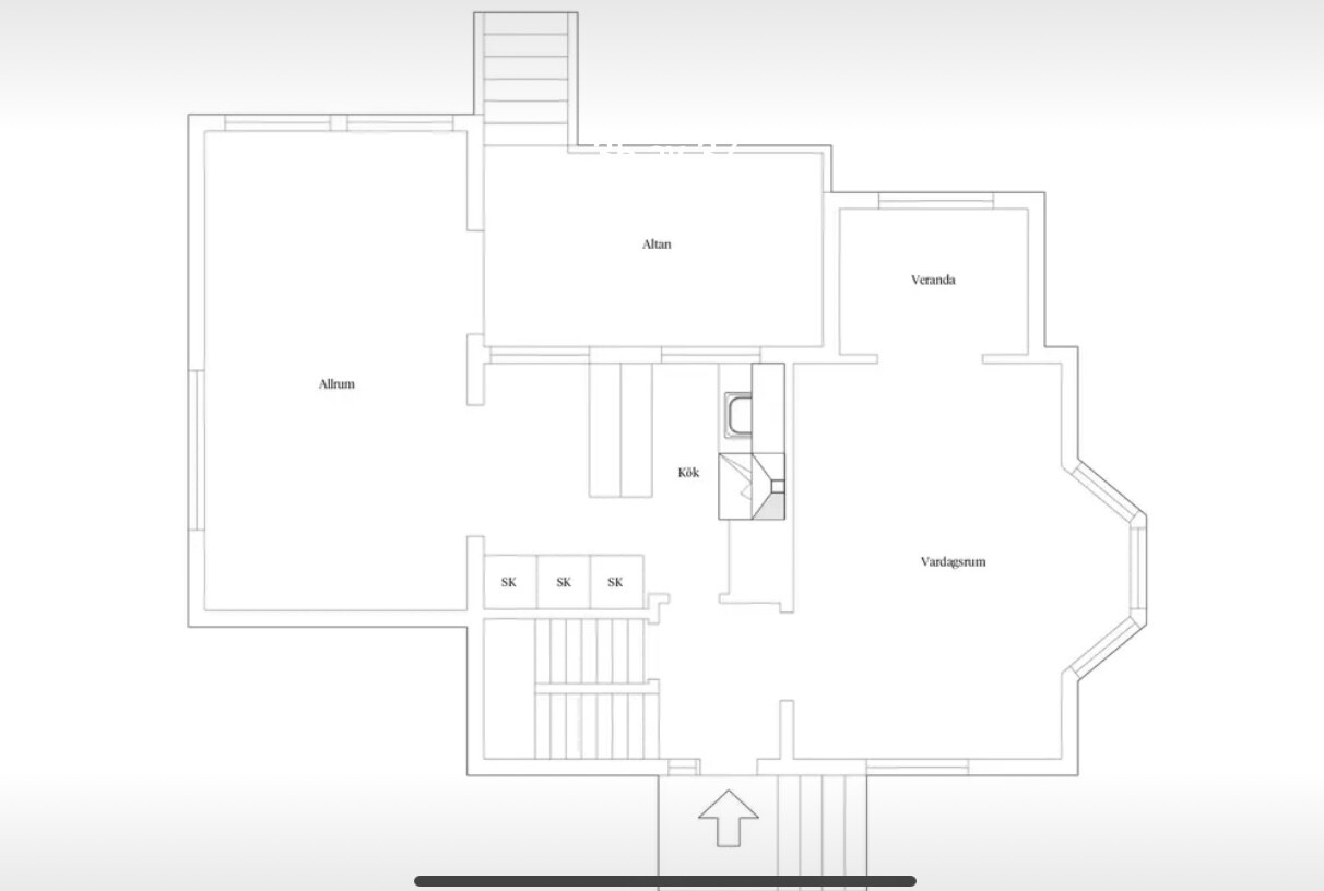 Se bild för huset och tillbyggnaden, detaljplan och planritning för entréplan (bilden med köket) och befintlig övergång.
