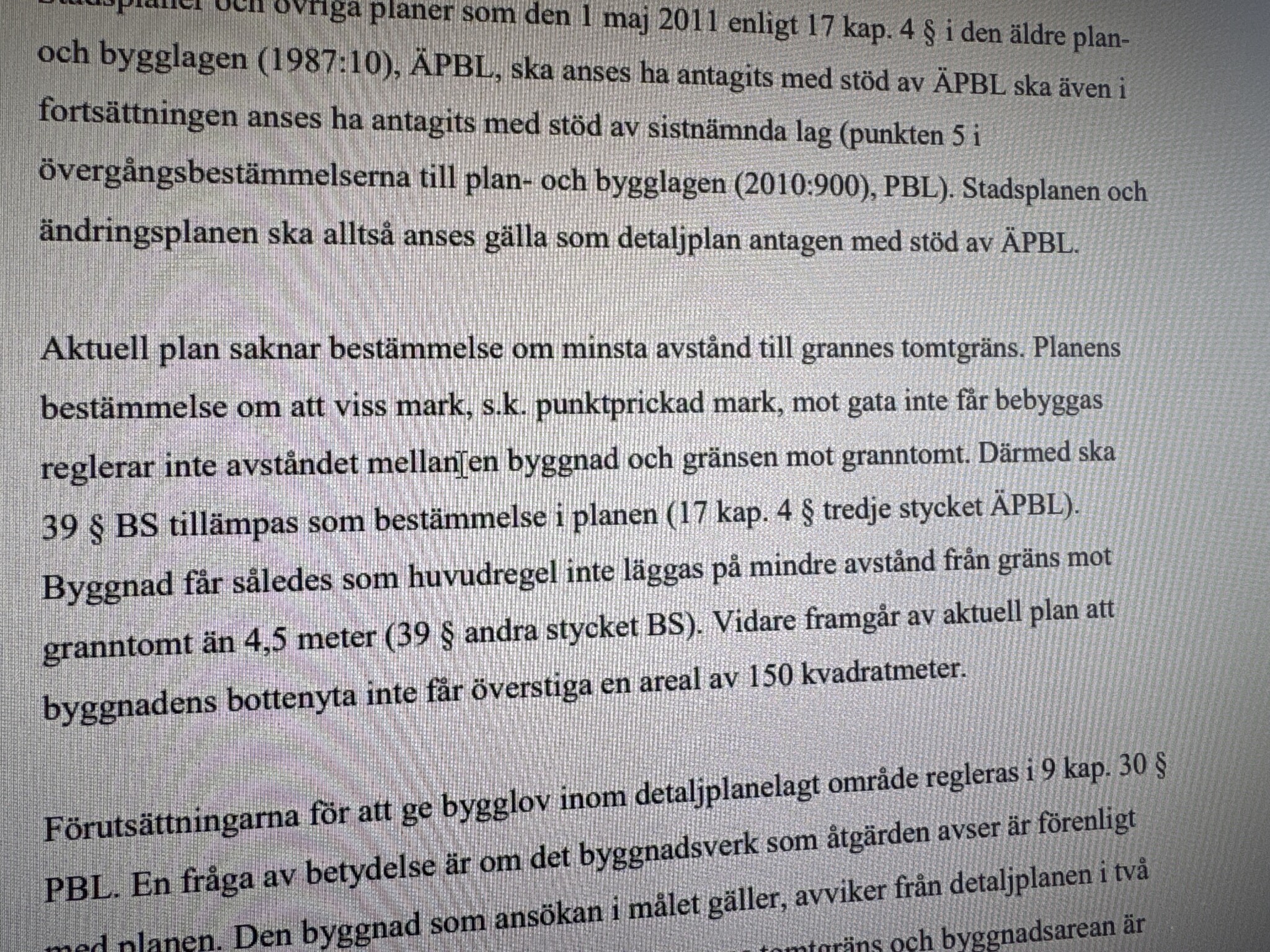 Du skriver att det punktpticlade i detaljplanen kan anses vara ”bestämmelse om placering”.H hempularen skrev:Jo, den kan nog vara planstridig. Men avvikelsen har godkänts vid ett tidigare bygglovsbeslut. Vilket gör läget lite bättre.