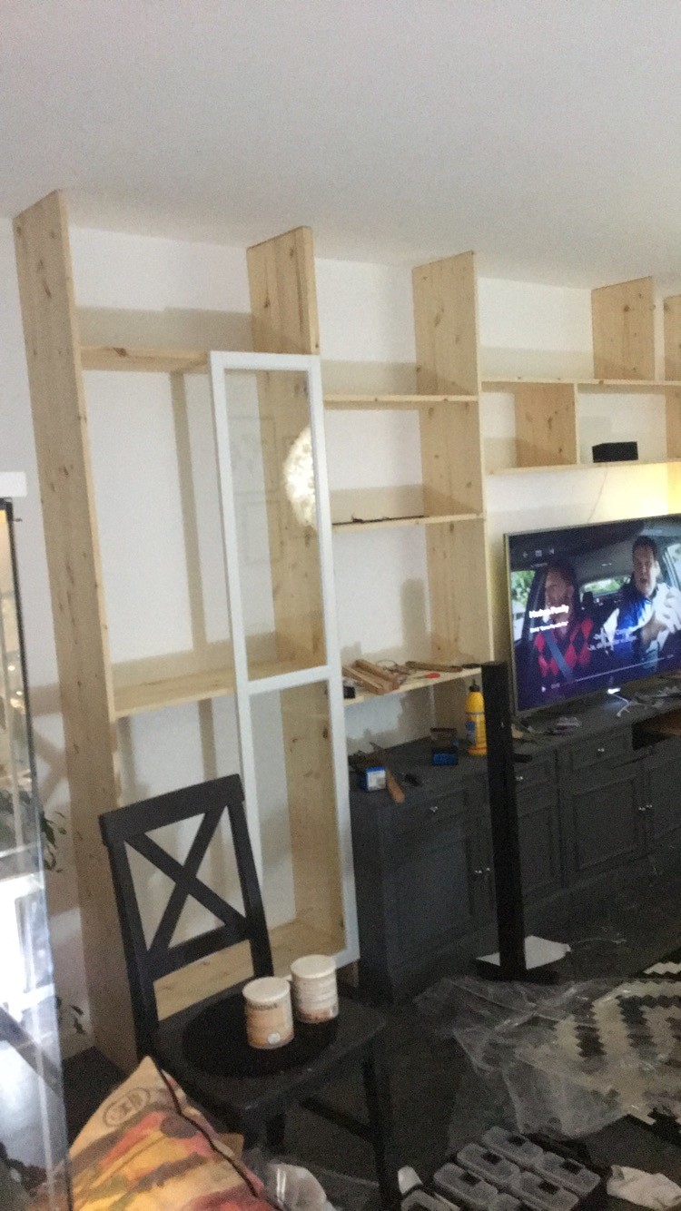Stommarna längst ner består av väldigt gamla skåp som vi fyndade på Facebook(gratis) sen är de 18x300mm limfog/träskivor som hyllorna samt vitrinskåpet är byggt utav. Hyllplanen är fastskruvade med 3x50 försänkt träskruv som sen är överspacklad innan färg.