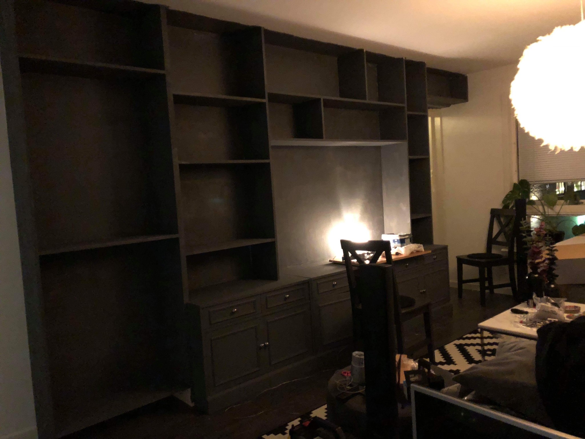 Det som är kvar just nu vad vi vet är att hänga upp tv:en på väggen och koppla in belysningen i vitrinskåpet.