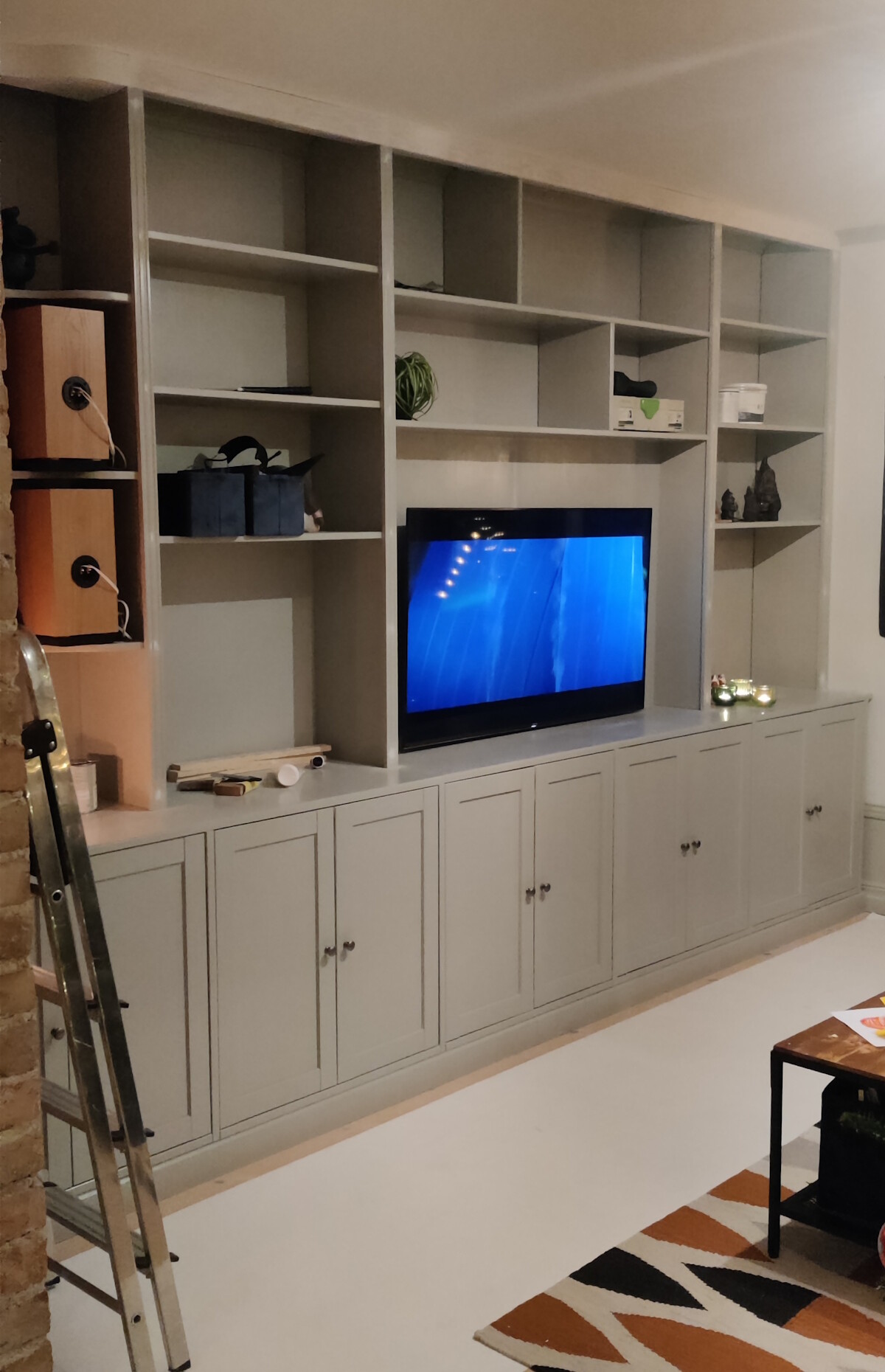 Tanken är att fixa en taklist sen så att det går hela vägen upp till taket, samt sätta spegel/dekorlister på luckorna och måla in allt… ej ännu bestämt exakt hur hyllorna ska vara. Förstår att det hade varit bäst att måla allt för sig först, men har inte kunnat bestämma färg ännu, så tips på hur jag bäst gör det tas också ta slant emot! Behöver jag slipa eller kan jag grundmåla på nåt sätt? 🙈